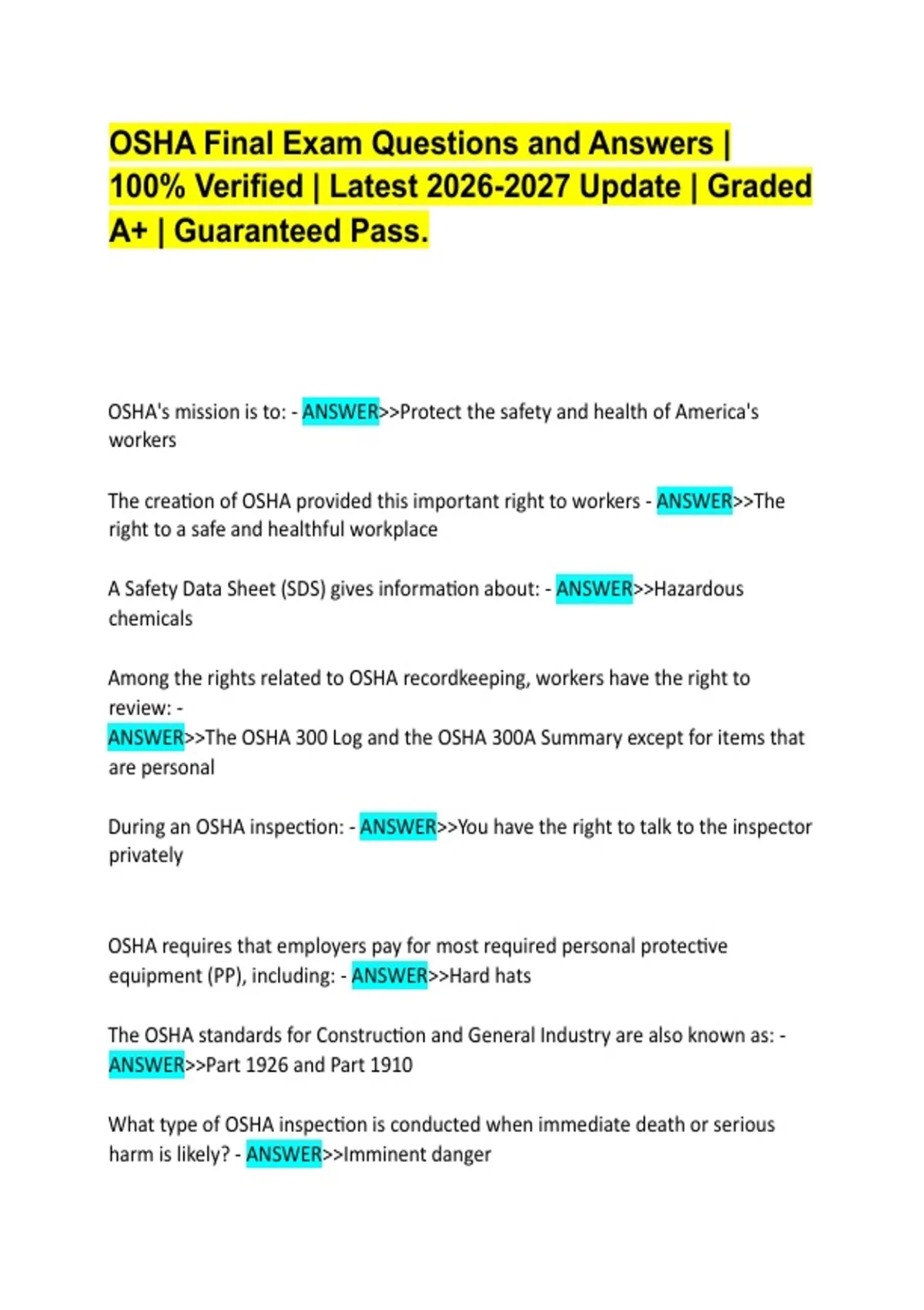 OSHA Final Exam Questions and Answers | 100% Verified | Latest Update | Graded A+ | Guaranteed Pass. OSHA's mission is to: - ANSWER>>Protect the safety and health of America's workers The creation of OSHA provided this important right to workers - ANSWER>>The right to a safe and healthful workplace A Safety Data Sheet (SDS) gives information about: - ANSWER>>Hazardous chemicals Among the rights related to OSHA recordkeeping, workers have the right to review: - ANSWER>>The OSHA 300 Log and the OSHA 300A Summary except for items that are personal During an OSHA inspection: - ANSWER>>You have the right to talk to the inspector privately OSHA requires that employers pay for most required personal protective equipment (PP), including: - ANSWER>>Hard hats The OSHA standards for Construction and General Industry are also known as: - ANSWER>>Part 1926 and Part 1910 What type of OSHA inspection is conducted when immediate death or serious harm is likely? - ANSWER>>Imminent danger When the employer receives an OSHA citation, it must be; - ANSWER>>Posted for 3 days or until the violation is fixed If you feel that an OSHA inspection is needed to get hazards corrected at your workplace, which is your best option? - ANSWER>>Submit a written, signed complaint with specific hazard information - ANSWER>>Electrical Safety OSHA's electrical standards are based on: - ANSWER>>The NEC What are the four main types of electrical injuries? - ANSWER>>Electrocution, electric shock, burns, indirect (e.g., a fall from a ladder) Electricity travels in closed circuits, and its normal route is through a conductor. Electric shock occurs when: - ANSWER>>The body becomes part of the circuit A shock's severity depends on: - ANSWER>>Length of exposure to electricity The amount of current and its frequency