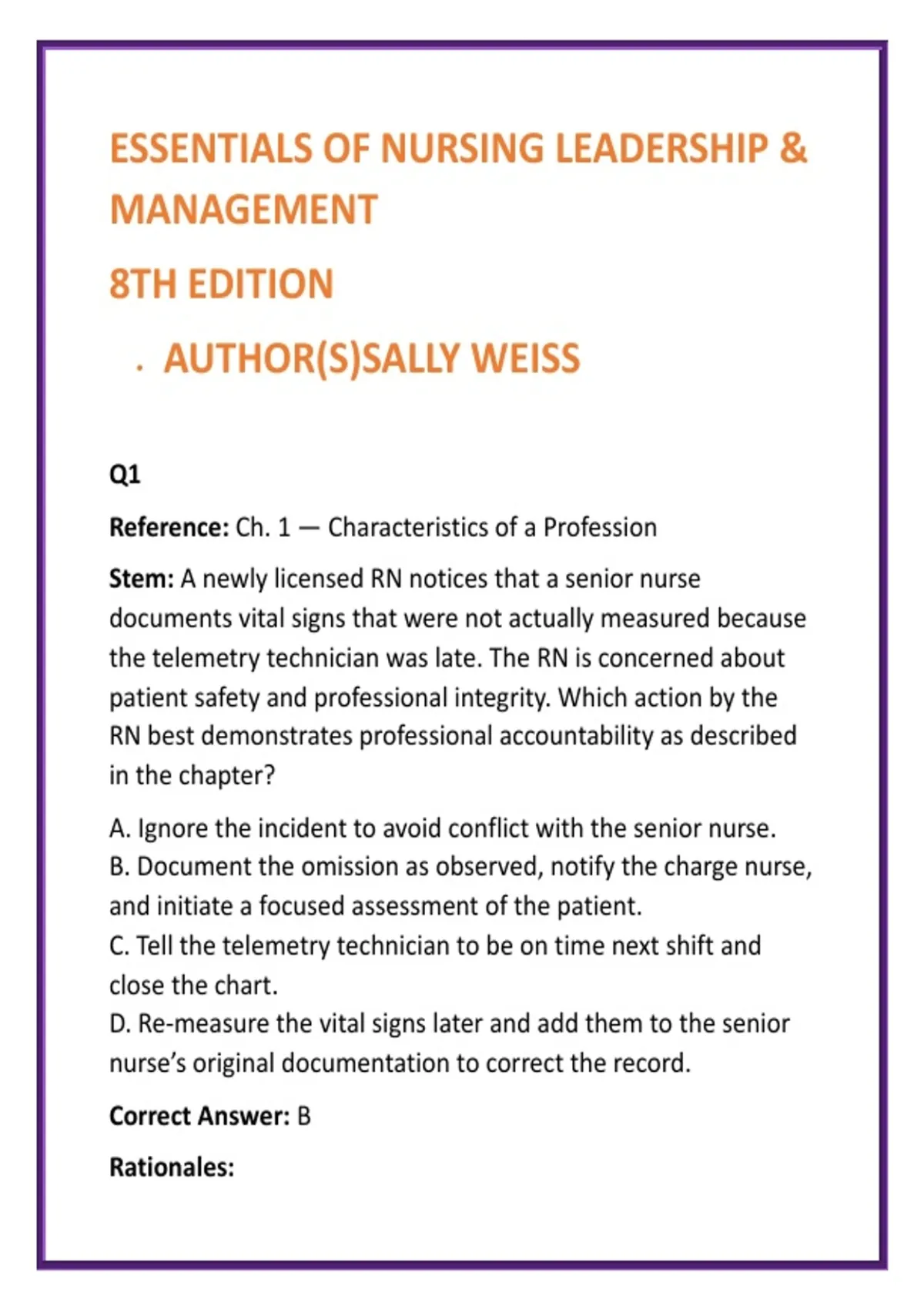 Nursing Leadership & Management Test Bank | Essentials of Nursing Leadership & Management 8th Ed Weiss | Delegation & Prioritization MCQs 2) SEO Product Description (200–300 words) Master nursing leadership, management, and professional practice with this comprehensive digital test bank based on Essentials of Nursing Leadership & Management, 8th Edition by Sally Weiss—one of the most widely adopted core texts in undergraduate nursing education. This test bank delivers full textbook coverage of ALL units and chapters, with 20 high-quality, leadership-focused MCQs per chapter. Every question is scenario-based and application-driven, mirroring real-world decisions faced by staff nurses, charge nurses, and novice nurse managers. Each item includes a clear, evidence-based rationale to strengthen clinical judgment, delegation accuracy, and management confidence. Designed for efficiency and results, this resource helps students move beyond memorization to true leadership readiness, supporting success in exams, clinical leadership roles, and transition-to-practice programs. What this test bank includes: Complete coverage of Essentials of Nursing Leadership & Management (8th Edition) 20 NCLEX-style leadership & management MCQs per chapter In-depth rationales grounded in leadership theory and professional standards Scenario-based questions on: Delegation, prioritization, and supervision Communication and conflict resolution Ethical and legal accountability Quality improvement and patient safety Healthcare systems and nurse manager decision-making Ideal for: Nursing Leadership & Management courses (ADN / BSN) Professional Nursing Practice coursework Nursing Administration and Leadership electives Capstone, final-semester, and comprehensive exams Transition-to-practice and preceptorship programs This test bank is a time-efficient, high-yield study tool trusted by nursing students seeking exam confidence and real-world leadership competence. 3) 8 High-Value SEO Keywords nursing leadership and management test bank Essentials of Nursing Leadership Weiss nursing management study guide delegation and prioritization MCQs nurse leadership exam questions nursing leadership NCLEX-style questions nursing management rationales test bank professional nursing practice leadership MCQs 4) 10 Hashtags #NursingLeadership #NursingManagement #NursingTestBank #NurseLeaderPrep #DelegationAndPrioritization #NursingStudents #BSNNursing #ADNNursing #NursingEducation #NurseManagerPrep