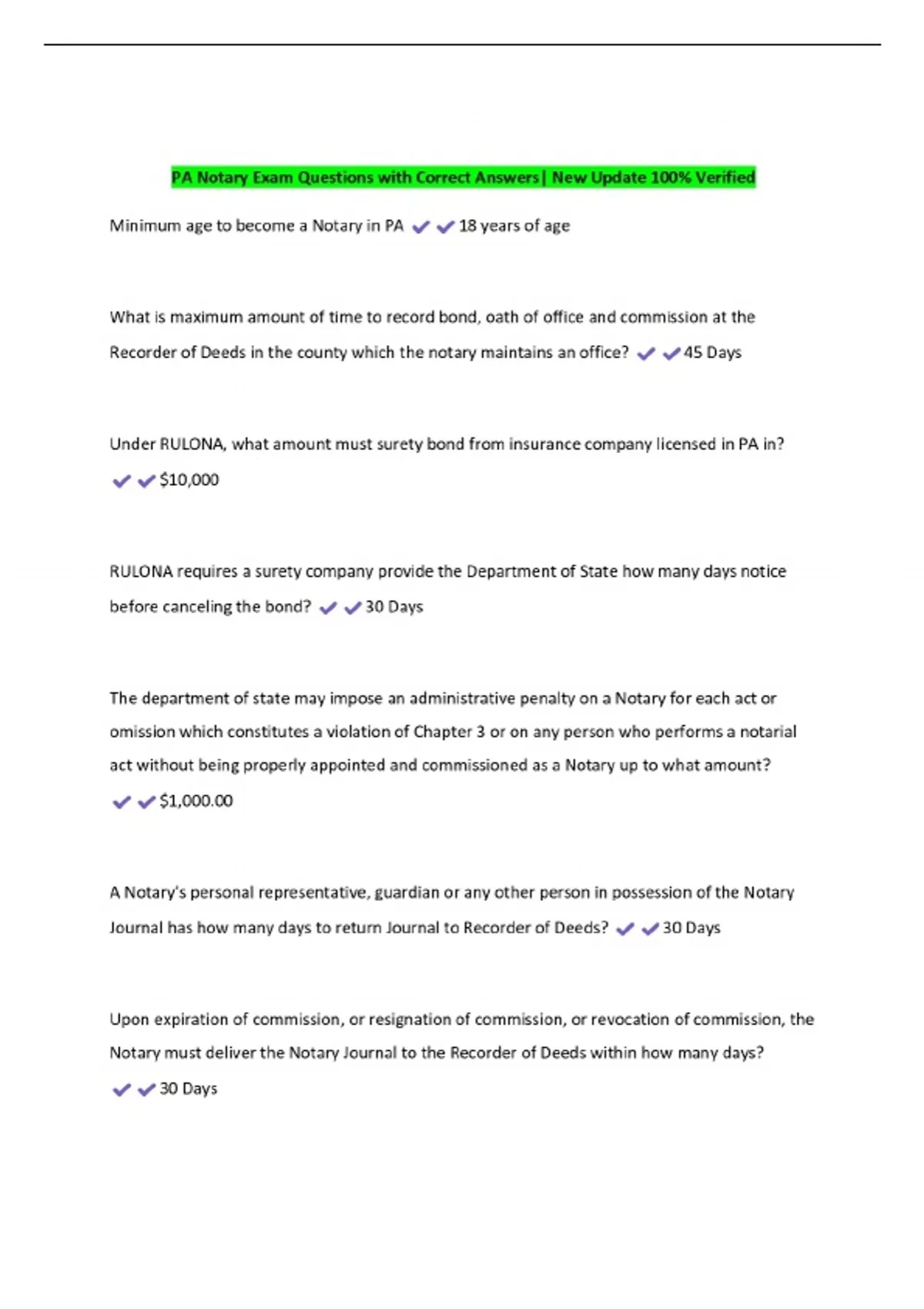 PA Notary Exam Questions with Correct Answers| New Update 100% Verified