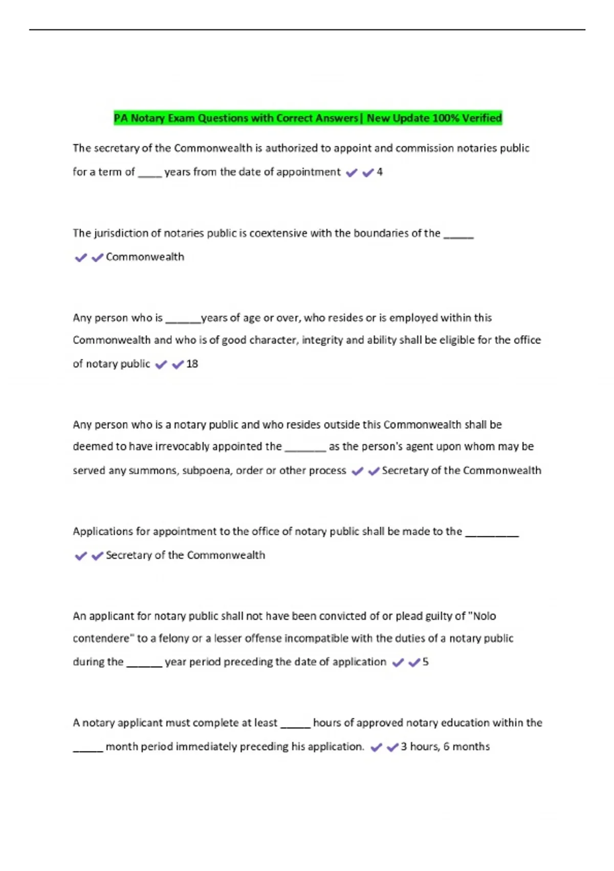 PA Notary Exam Questions with Correct Answers| New Update 100% Verified