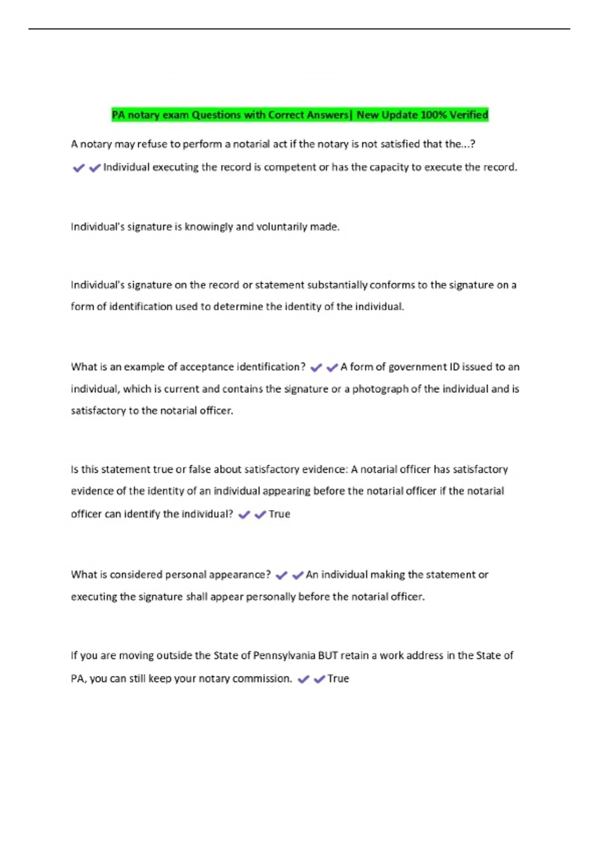 pa notary exam questions with correct answers new