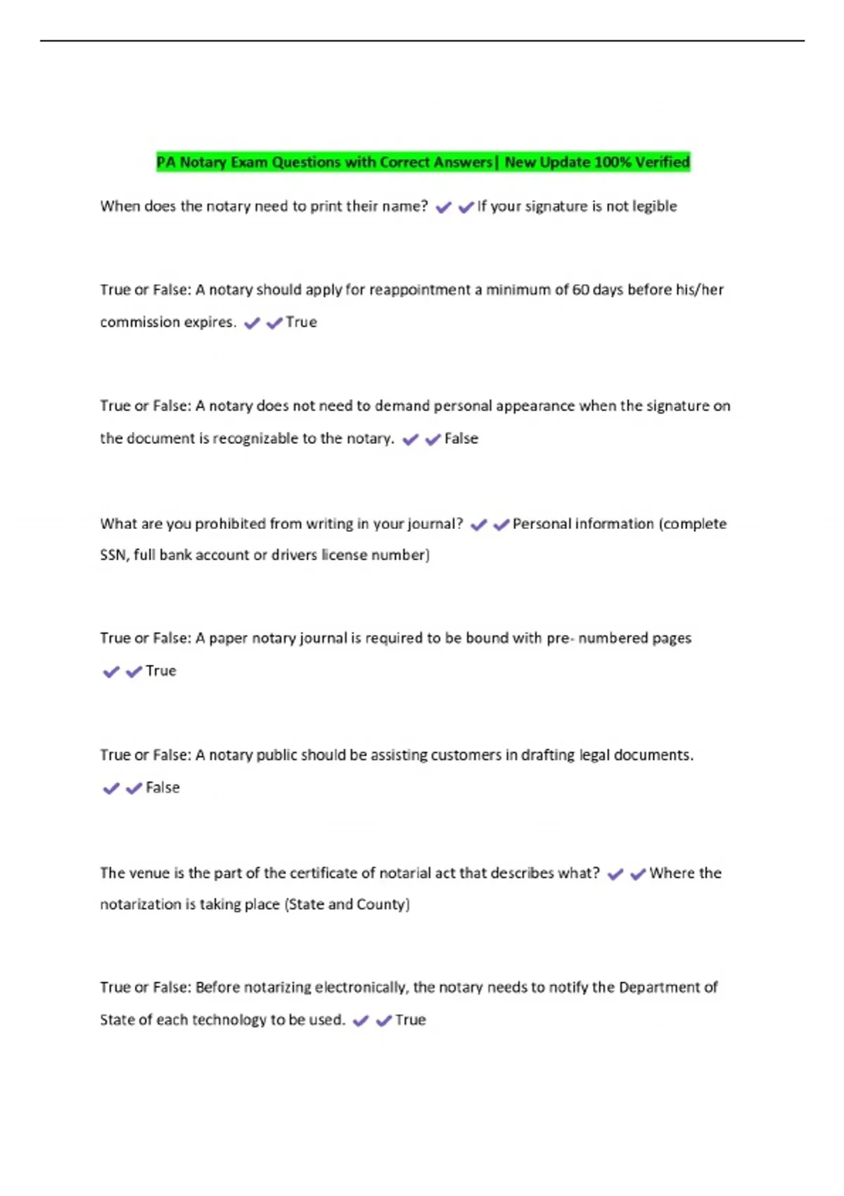 PA Notary Exam Questions with Correct Answers| New Update 100% Verified