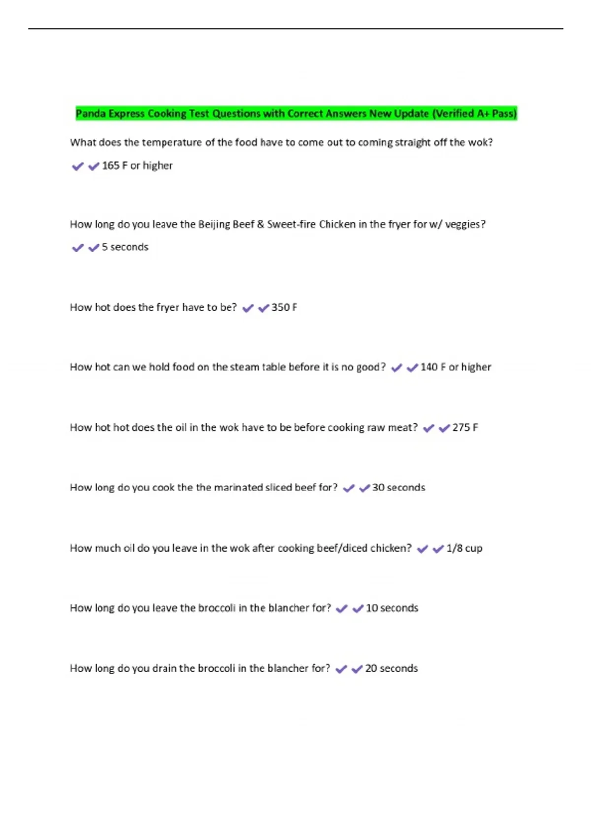 Panda Express Cooking Test Questions with Correct Answers New Update (Verified A+ Pass)