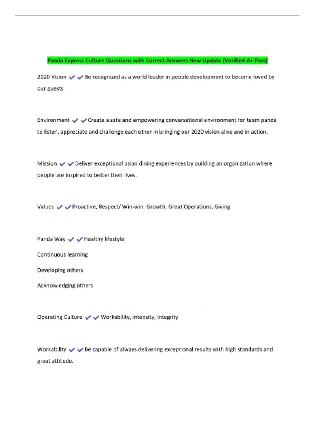 Panda Express Culture Questions with Correct Answers New Update (Verified A+ Pass)