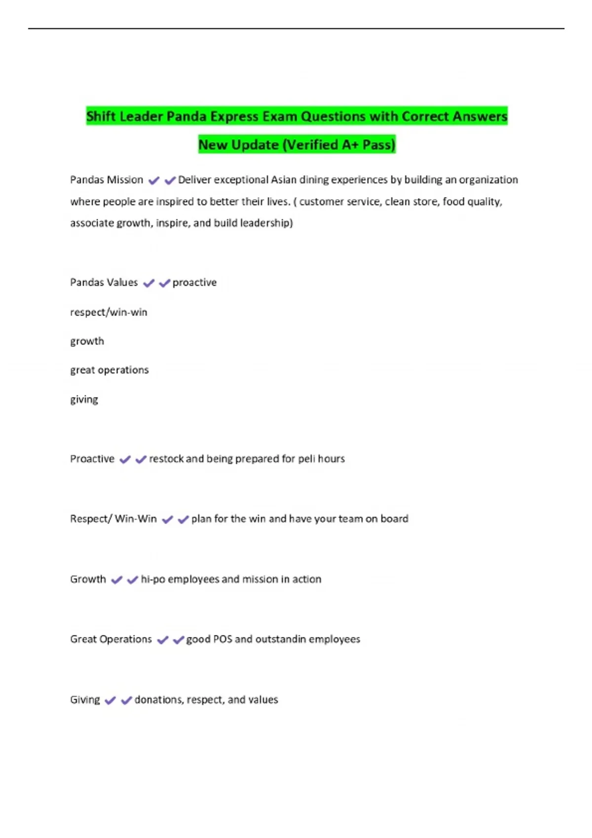 Shift Leader Panda Express Exam Questions with Correct Answers New Update (Verified A+ Pass)
