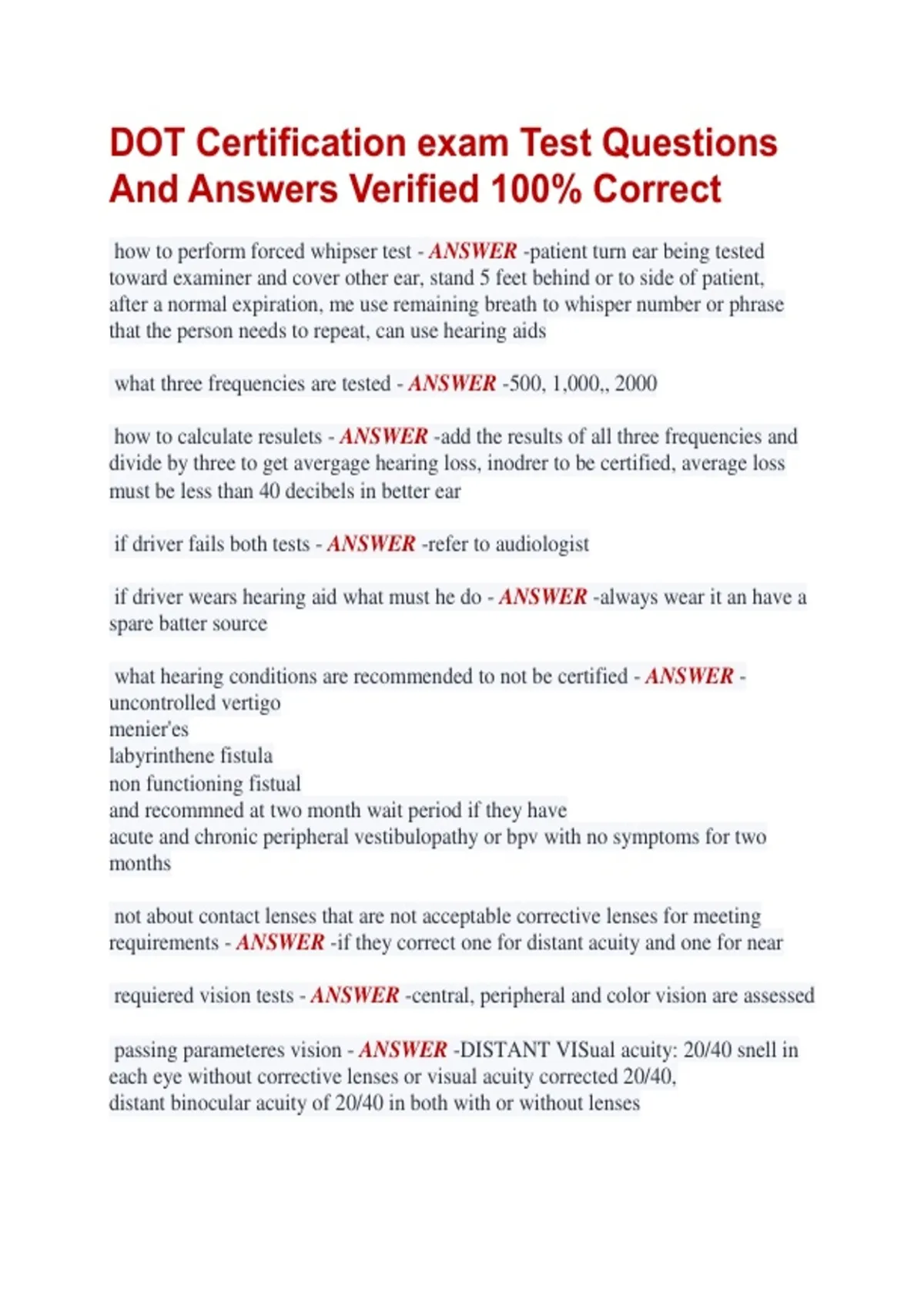 DOT Certification exam Test Questions And Answers Verified 100% Correct how to perform forced whipser test - ANSWER -patient turn ear being tested toward examiner and cover other ear, stand 5 feet behind or to side of patient, after a normal expiration, me use remaining breath to whisper number or phrase that the person needs to repeat, can use hearing aids what three frequencies are tested - ANSWER -500, 1,000,, 2000 how to calculate resulets - ANSWER -add the results of all three frequencies and divide by three to get avergage hearing loss, inodrer to be certified, average loss must be less than 40 decibels in better ear if driver fails both tests - ANSWER -refer to audiologist if driver wears hearing aid what must he do - ANSWER -always wear it an have a spare batter source what hearing conditions are recommended to not be certified - ANSWER uncontrolled vertigo menier'es labyrinthene fistula non functioning fistual and recommned at two month wait period if they have acute and chronic peripheral vestibulopathy or bpv with no symptoms for two months not about contact lenses that are not acceptable corrective lenses for meeting requirements - ANSWER -if they correct one for distant acuity and one for near requiered vision tests - ANSWER -central, peripheral and color vision are assessed passing parameteres vision - ANSWER -DISTANT VISual acuity: 20/40 snell in each eye without corrective lenses or visual acuity corrected 20/40, distant binocular acuity of 20/40 in both with or without lenses reasons drivers fail for vision - ANSWER -telescopic lenses are not accepted as a way to correct loss of central vision and will be disqualified what colors must they be able to recognize - ANSWER -red, green , amber does colorblindness disqualify driver - ANSWER -no but must be able to see red, green and amber monocular vision is what - ANSWER -whenonly one eye meets requirements with or without correction, they are disqualified if driver is disqualified for vision then wht - ANSWER -can apply for exception federal vision excemption; - ANSWER -for monocular vision issued for two years, eye doctor must exam in previous three months, must have valid report, can be certified for one year, check accompanied by exception box, annual eye doctor visit required, and letter, qualified for one year what type of vision affected wtih macular degenration - ANSWER -centeral, decrese visual cuiy, takes longer to recover from bright lights treatment age related macular degenration - ANSWER -telescopic lenses attept to compensate but reduce peripheral vision so are not allowed -zinc, antioxidants, vascular endothelial growth inhibitors what is glaucoma - ANSWER -increased intraocular pressure leading to atrophy of optic nerve cells what visoin is affected with glaucoma - ANSWER -peripheral vision, also night and color symptoms of glaucoma - ANSWER -painless, gradual loss of vison tx of glaucoma - ANSWER -beta blocking agents alpha blocking, cholinergic agonists somotic agents, prostaglandin analogs, combination cataracts cause what - ANSWER -diminished visual acuity due to opacified lenses cataracts s/s - ANSWER -glare is early sympom, decreased color and contrast resolution, what accelerated cataracts - ANSWER -injury, radiation, steroids, gout, diabetes tx of cataracts - ANSWER -suregery removal of catarcts and replacemtn of occular lese retinopathy is whta - ANSWER -non inflmmatory retinal damage usually by diabetes, intraretinal hemorrhgaes and microaneurysms commmons s/s of retinopathy - ANSWER -contrast sensitivity, color idenfication vision loss retinopathy treatmetn - ANSWER -strict glucose control, manage comoridities. if diabetes, annual exam, annual eye exam, unstable proliferative retinopathy is disqualifigying bp cuff too small results in - ANSWER -a falsely elevated reasons bp cuff to large means - ANSWER -falsely low stage 1 htn - ANSWER -over 140/90 but less than 160/100 drivers certified for one year if this is first tie being diagnosed with htn and not on medicine a one time three month certificate given to driver if - ANSWER -presents with one year certificate prior untrated stage 1 tgn, no prescriptions for meds, has diaggnosis of tn and being and is being treated with htn meds, and has no s/e could lead to problems the 3 month cert - ANSWER -cannot be given back to back but not limited to one per lifetime reasons to disqualify driver with stage 1 htn: - ANSWER -3 moth certificate and bp still over 140/90 or driver has a history of stage 3 htn with current bp over 140/90 he can be recertified for one year once he gets it down stage 2 htn - ANSWER -between 160/100 but less 180/110
