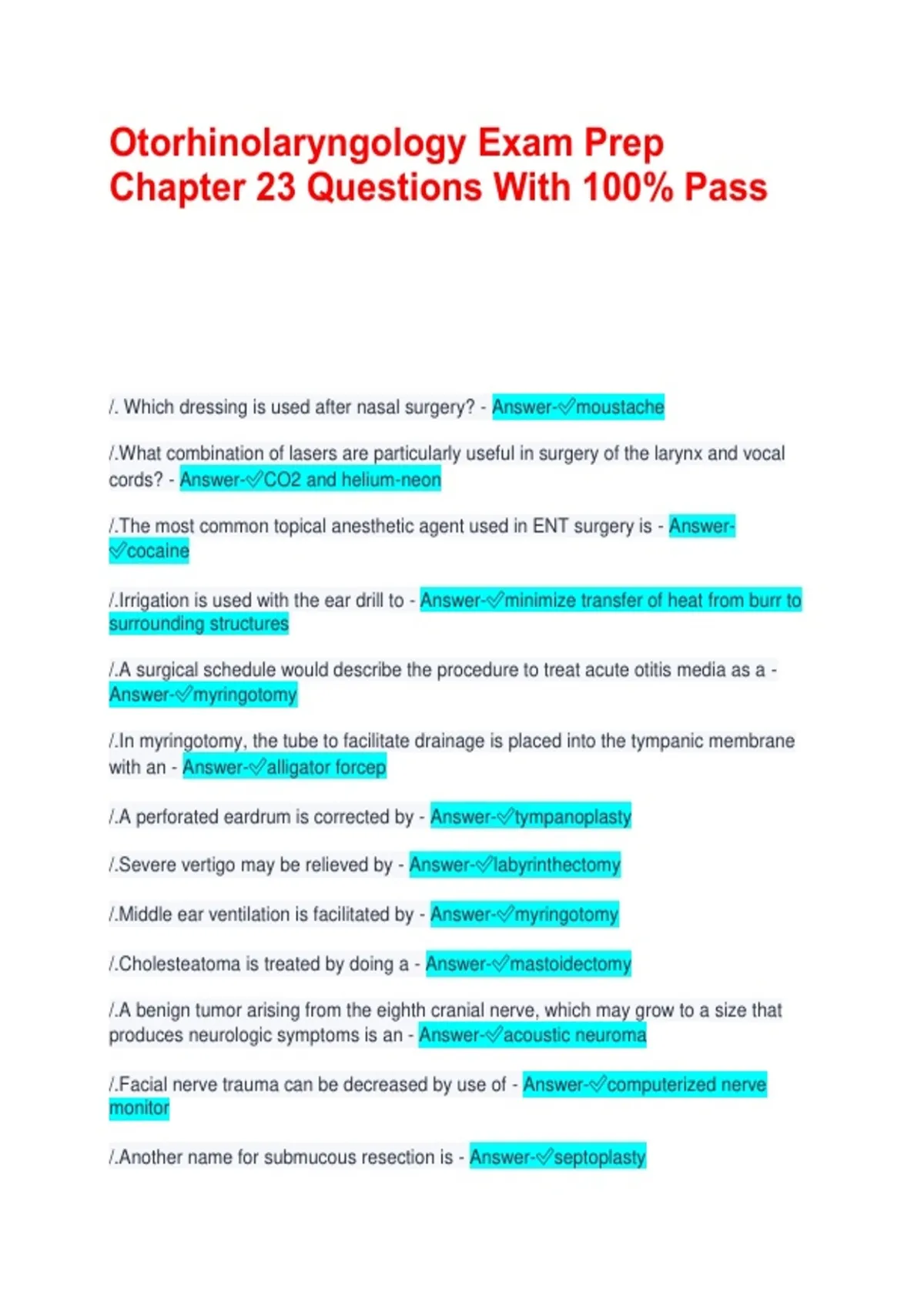 Otorhinolaryngology Exam Prep Chapter 23 Questions With 100% Pass /. Which dressing is used after nasal surgery? - Answer-moustache /.What combination of lasers are particularly useful in surgery of the larynx and vocal cords? - Answer-CO2 and helium-neon /.The most common topical anesthetic agent used in ENT surgery is - Answer-cocaine /.Irrigation is used with the ear drill to - Answer-minimize transfer of heat from burr to surrounding structures /.A surgical schedule would describe the procedure to treat acute otitis media as a - Answer-myringotomy /.In myringotomy, the tube to facilitate drainage is placed into the tympanic membrane with an - Answer-alligator forcep /.A perforated eardrum is corrected by - Answer-tympanoplasty /.Severe vertigo may be relieved by - Answer-labyrinthectomy /.Middle ear ventilation is facilitated by - Answer-myringotomy /.Cholesteatoma is treated by doing a - Answer-mastoidectomy /.A benign tumor arising from the eighth cranial nerve, which may grow to a size that produces neurologic symptoms is an - Answer-acoustic neuroma /.Facial nerve trauma can be decreased by use of - Answer-computerized nerve monitor /.Another name for submucous resection is - Answer-septoplasty