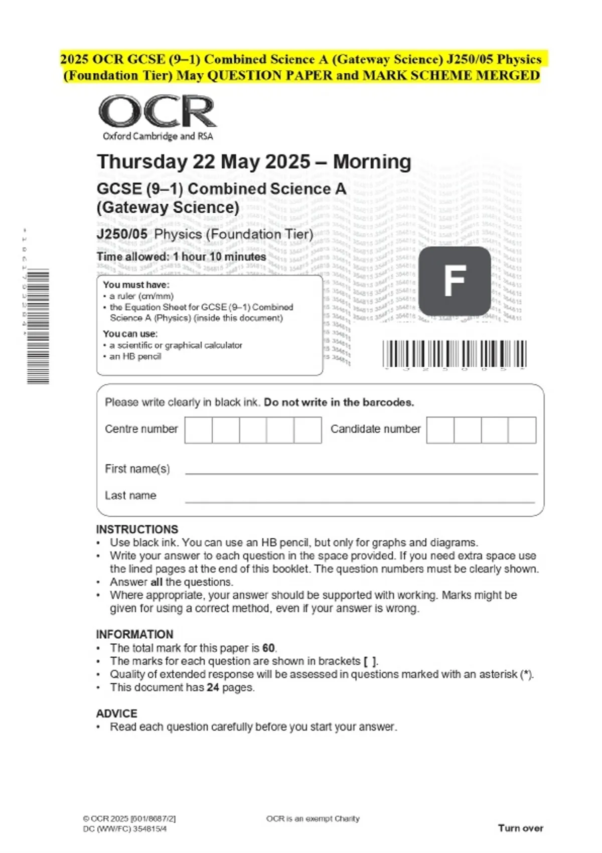 2025 OCR GCSE (9–1) Combined Science A (Gateway Science) J250/05 Physics (Foundation Tier) May QUESTION PAPER and MARK SCHEME MERGED