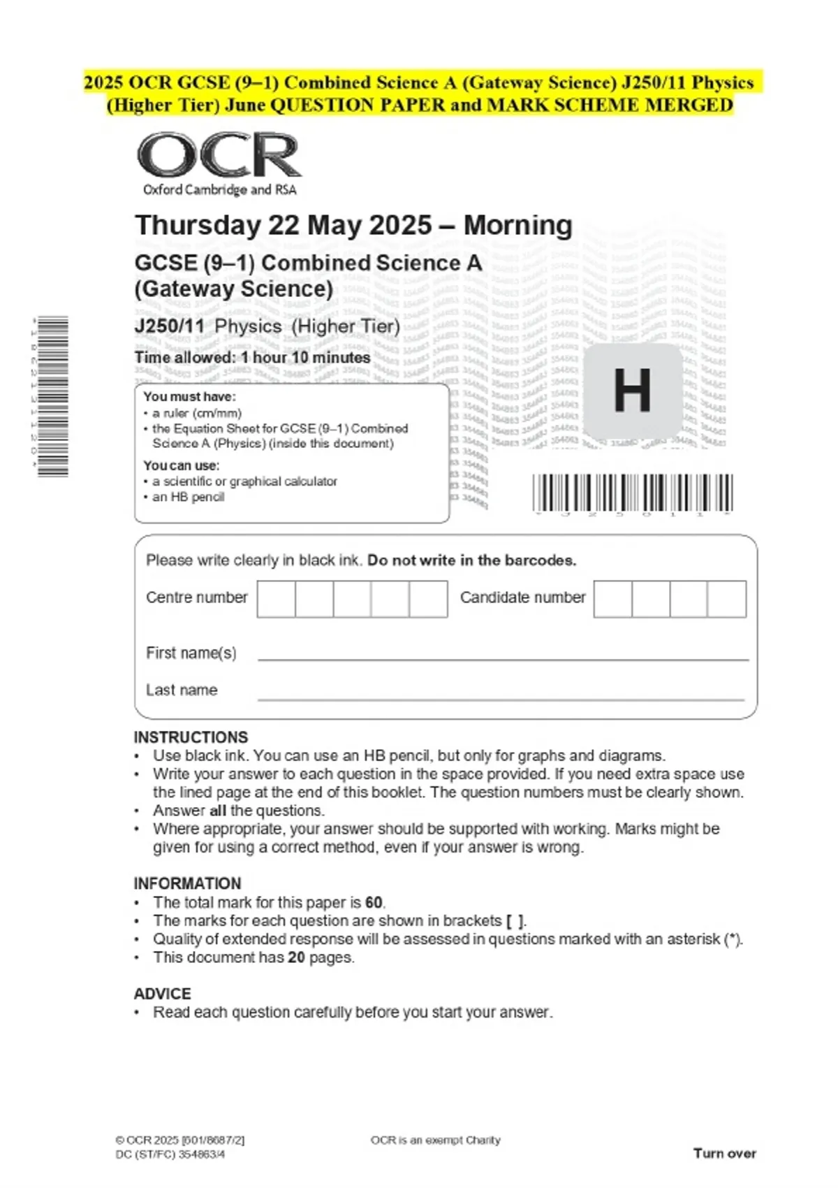 2025 OCR GCSE (9–1) Combined Science A (Gateway Science) J250/11 Physics (Higher Tier) June QUESTION PAPER and MARK SCHEME MERGED