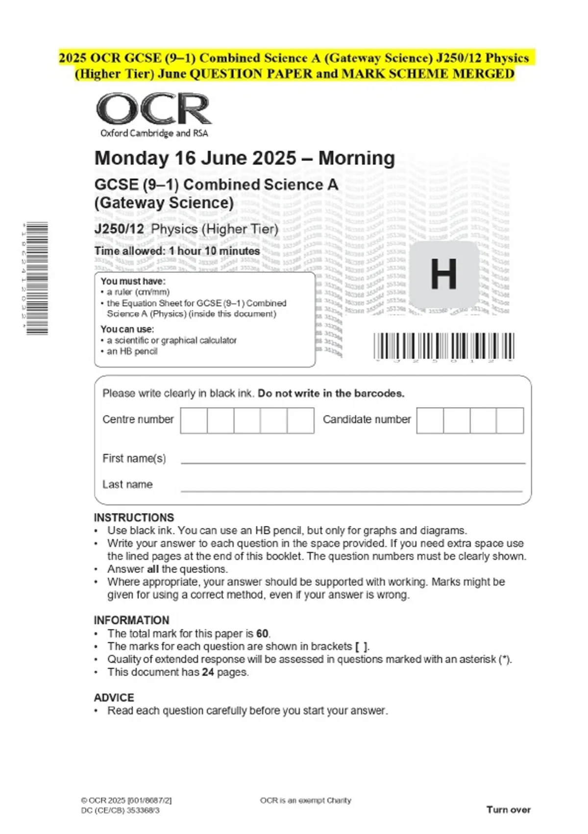 2025 OCR GCSE (9–1) Combined Science A (Gateway Science) J250/12 Physics (Higher Tier) June QUESTION PAPER and MARK SCHEME MERGED