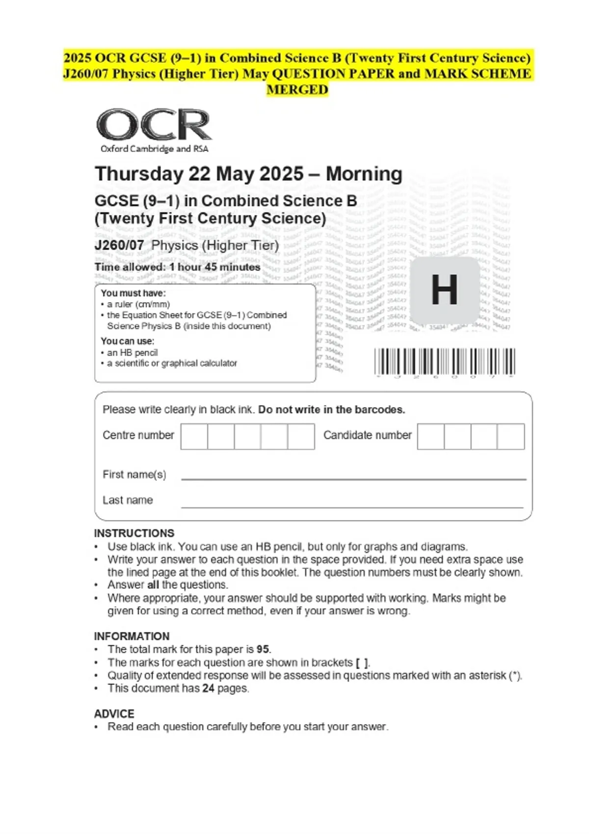2025 OCR GCSE (9–1) in Combined Science B (Twenty First Century Science) J260/07 Physics (Higher Tier) May QUESTION PAPER and MARK SCHEME MERGED