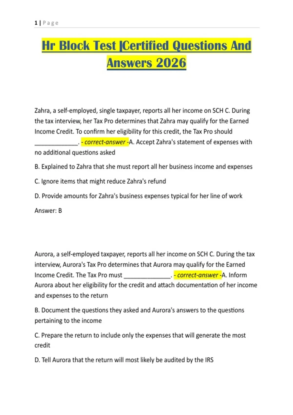 Hr Block Test |Certified Questions And