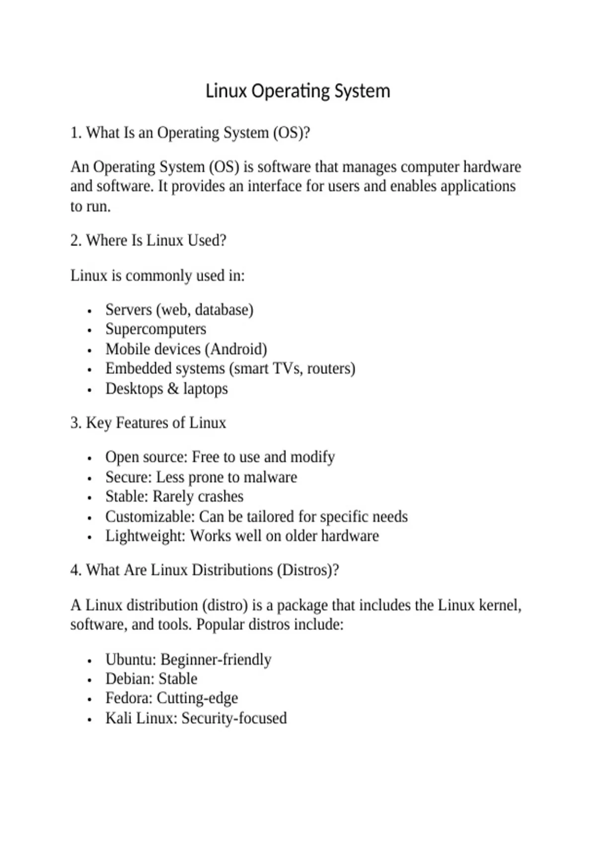 This document provides a brief overview of the Linux Operating System, covering its key features, common use cases, and differences from Windows. It explains Linux’s open-source nature, security, and customizability, and highlights popular distributions like Ubuntu and Fedora. The notes also touch on the Linux kernel, its role in the system, and why Linux is widely used in servers, supercomputers, and mobile devices. Perfect for anyone looking for a quick introduction to Linux.