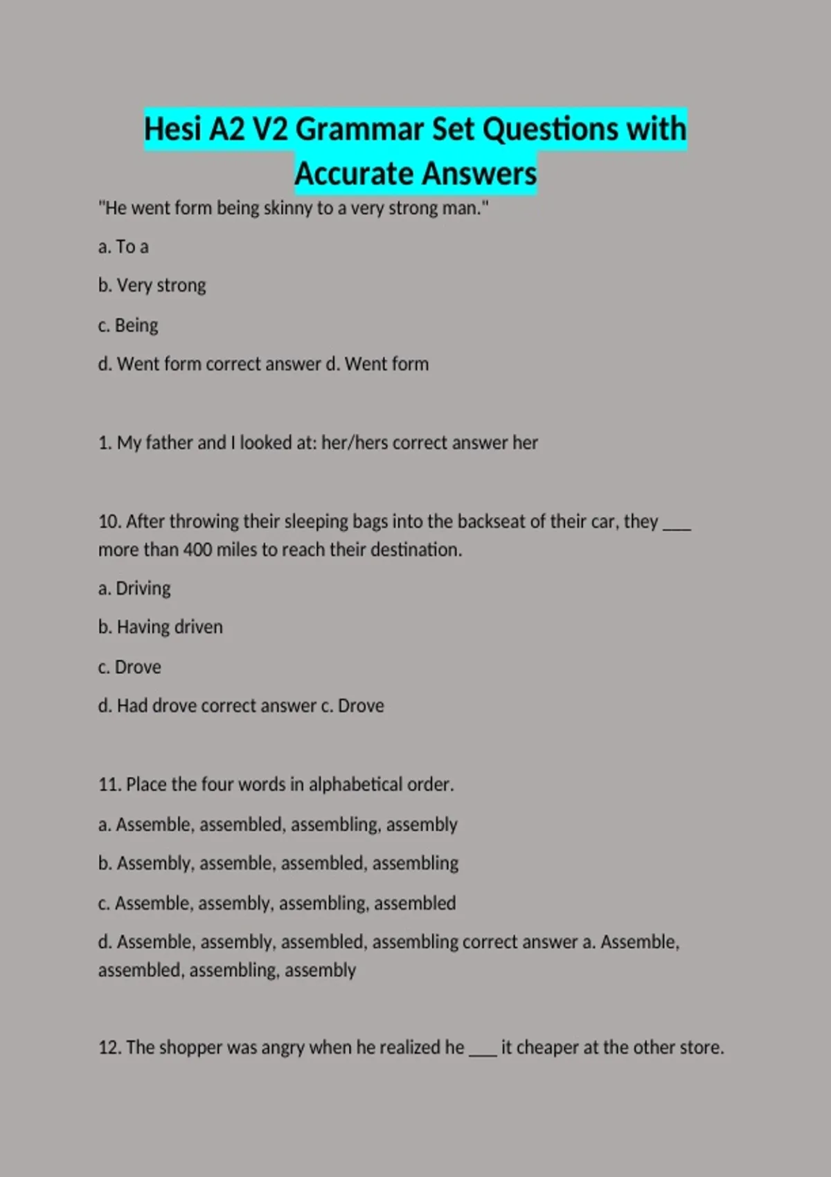 "He went form being skinny to a very strong man." a. To a b. Very strong c. Being d. Went form correct answer d. Went form 1. My father and I looked at: her/hers correct answer her 10. After throwing their sleeping bags into the backseat of their car, they ___ more than 400 miles to reach their destination. a. Driving b. Having driven c. Drove d. Had drove correct answer c. Drove 11. Place the four words in alphabetical order. a. Assemble, assembled, assembling, assembly b. Assembly, assemble, assembled, assembling c. Assemble, assembly, assembling, assembled d. Assemble, assembly, assembled, assembling correct answer a. Assemble, assembled, assembling, assembly 12. The shopper was angry when he realized he ___ it cheaper at the other store.