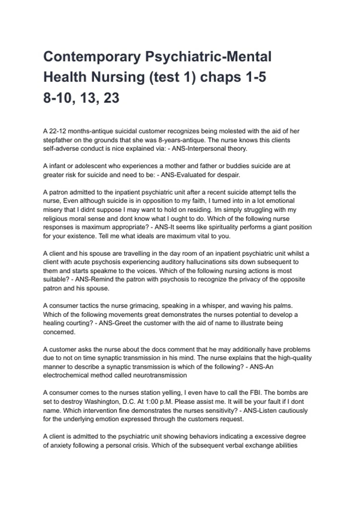 Contemporary Psychiatric-Mental Health Nursing (test 1) chaps 1-5 8-10, 13, 23 NEWEST 2026/2027 ACTUAL EXAM COMPLETE QUESTIONS AND CORRECT DETAILED ANSWERS (VERIFIED ANSWERS) |ALREADY GRADED A+||BRAND NEW!!