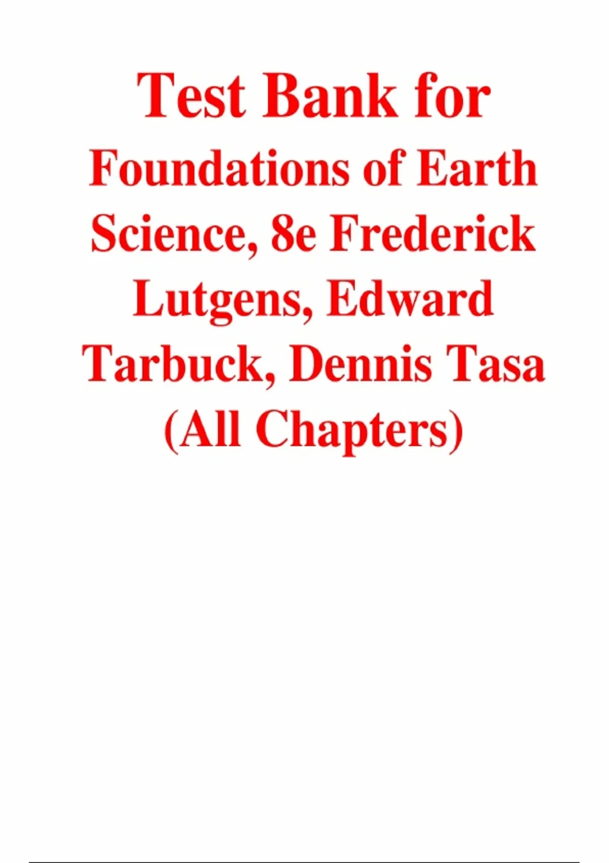 Foundations of Earth Science, 8th Edition – Frederick K. Lutgens, Edward J. Tarbuck, Dennis G. Tasa – ISBN 9780135851999 – Test Bank (All Chapters Covered 1–17). This test bank provides comprehensive exam coverage across all 17 chapters of the text, organized into seven thematic units. Unit I: Earth Materials includes Chapter 1 Matter and Minerals and Chapter 2 Rocks: Materials of the Solid Earth. Unit II: Forces Within covers Chapter 3 Plate Tectonics: A Scientific Revolution Unfolds, Chapter 4 Restless Earth: Earthquakes and Mountain Building, and Chapter 5 Volcanoes and Other Igneous Activity. Unit III: Sculpting Earth's Surface includes Chapter 6 Landscapes Fashioned by Water and Chapter 7 Glacial and Arid Landscapes. Unit IV: Deciphering Earth's History focuses on Chapter 8 Geologic Time. Unit V: The Global Ocean explores Chapter 9 Oceans: The Last Frontier and Chapter 10 The Restless Ocean. Unit VI: Earth's Dynamic Atmosphere includes Chapter 11 Heating the Atmosphere, Chapter 12 Moisture, Clouds, and Precipitation, Chapter 13 The Atmosphere in Motion, and Chapter 14 Weather Patterns and Severe Weather. Finally, Unit VII: Earth's Place in the Universe covers Chapter 15 The Nature of the Solar System and Chapter 16 Beyond Our Solar System.