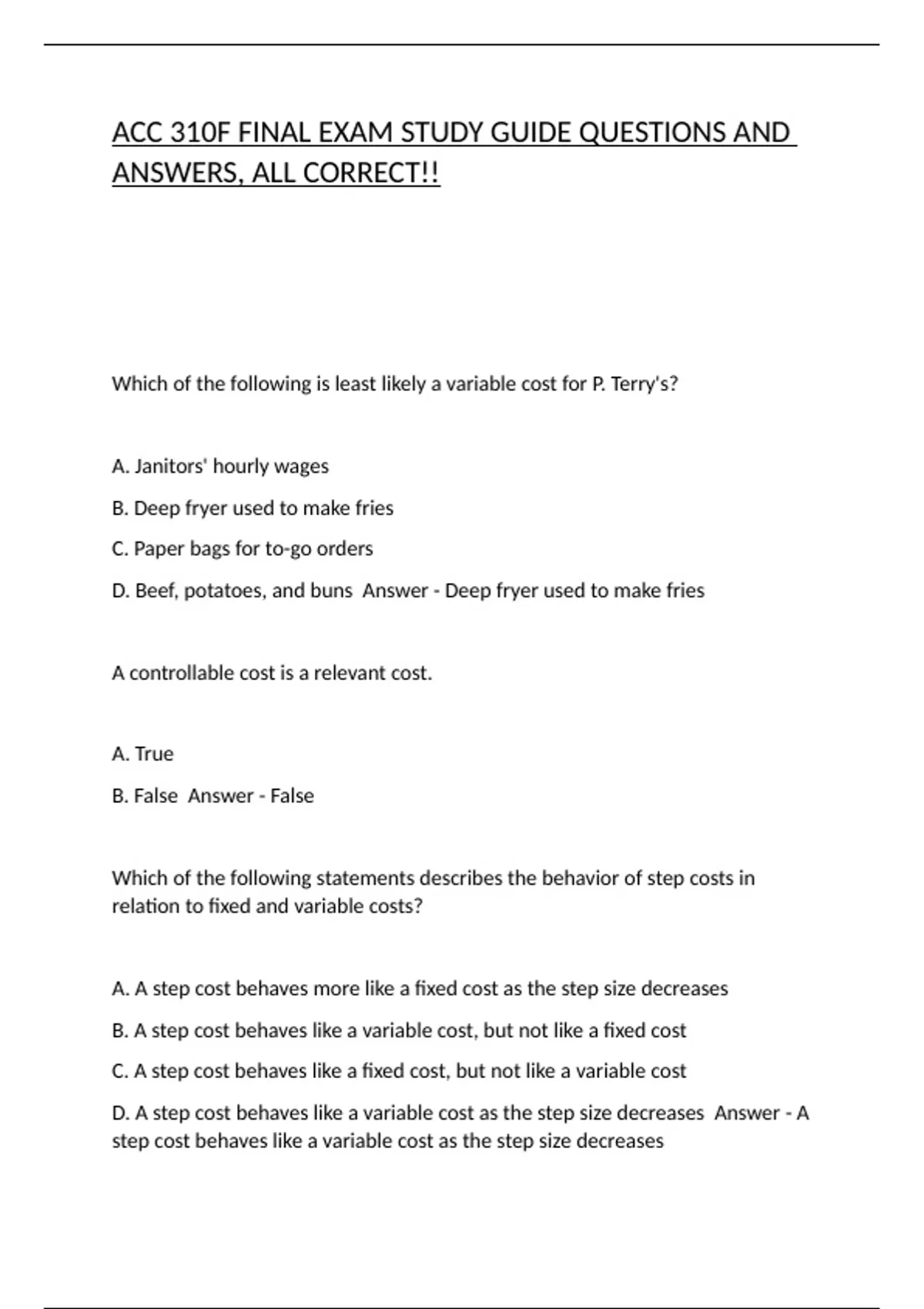 ACC 310F FINAL EXAM STUDY GUIDE QUESTIONS AND ANSWERS, ALL CORRECT!!