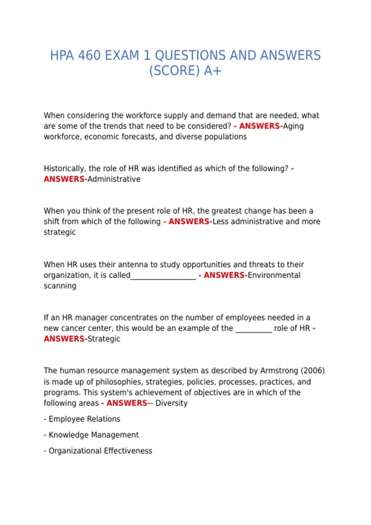 HPA 460 EXAM 1 QUESTIONS AND ANSWERS