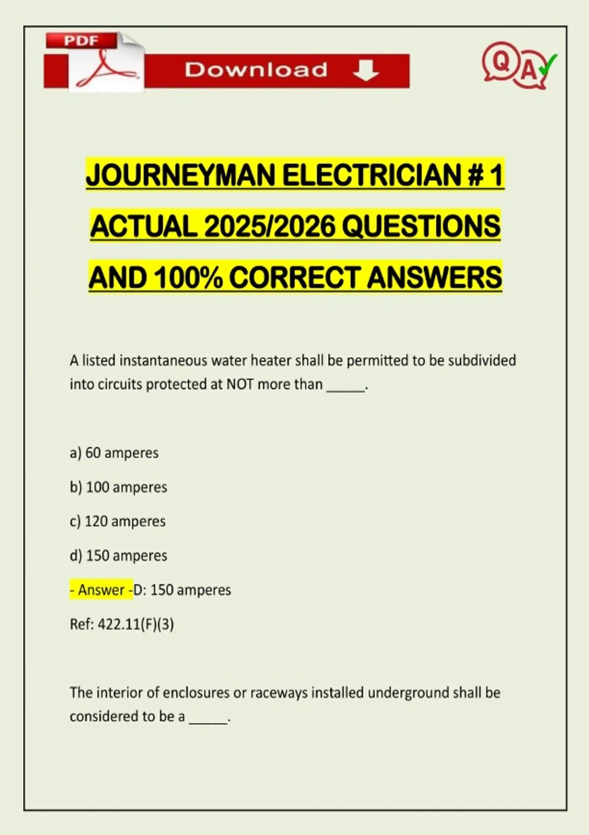 JOURNEYMAN ELECTRICIAN # 1 ACTUAL 2025/2026 QUESTIONS AND 100% CORRECT ANSWERS A listed instantaneous water heater shall be permitted to be subdivided into circuits protected at NOT more than _____. a) 60 amperes b) 100 amperes c) 120 amperes d) 150 amperes - Answer -D: 150 amperes Ref: 422.11(F)(3) The interior of enclosures or raceways installed underground shall be considered to be a _____.Need assistance on Online classes, Exams & Assignments? Reach out for instant help!! Full Course Assistance, Plagiarism-free Essay Writing, Research Paper, Dissertation, Discussion Posts, etc…. Confidential & Secure services. Tutors are available for all subjects! Email now at: a) wet location b) damp location c) moist location d) dry location - Answer -A: wet location Ref: 300.5(B)