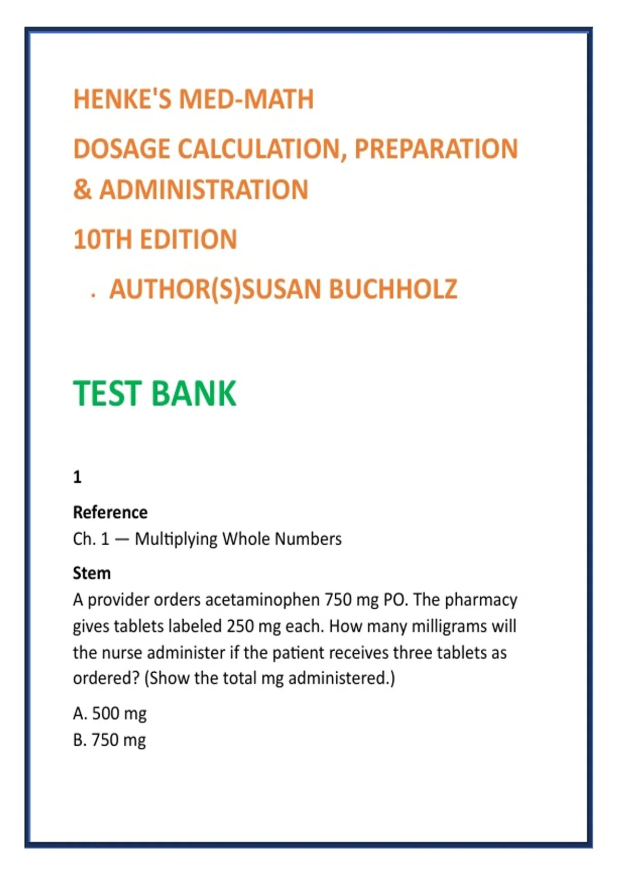 Henke’s Med-Math Test Bank | Nursing Test Bank 2026 for Dosage Calculation Nursing MCQs & Medication Administration Math 2) SEO Product Description (200–300 words) Master nursing dosage calculations with confidence using this Henke’s Med-Math: Dosage Calculation, Preparation & Administration (10th Edition) Test Bank—a comprehensive, exam-ready resource built for accuracy, safety, and clinical relevance. Designed around Susan Buchholz’s gold-standard text, this nursing test bank 2026 delivers full textbook coverage with calculation-focused practice that mirrors real medication-administration demands. Each chapter includes 20 rigorously constructed MCQs emphasizing dimensional analysis, ratio–proportion, fractions, decimals, percents, and weight-based dosing. Questions are embedded in realistic clinical scenarios—oral, parenteral, IV, pediatric, and adult—ensuring learners practice not just math, but safe medication preparation and administration. Every item includes verified answers with step-by-step rationales, reinforcing correct setup, unit consistency, and error prevention. This digital test bank is ideal for students in: Dosage Calculation & Medication Math courses Medication Administration courses Practical Nursing (PN/LPN) programs Associate Degree Nursing (ADN) programs Pre-clinical skills, Foundations-of-Practice math modules Skills check-offs and competency validation coursework Key features Full-chapter coverage of the 10th Edition text 20 clinically accurate MCQs per chapter Detailed rationales aligned with Henke’s Med-Math methods Emphasis on patient safety and calculation accuracy Time-saving, self-paced digital format for efficient study Whether preparing for exams, skills validation, or clinical practice, this Buchholz med-math review strengthens calculation accuracy, reduces medication errors, and builds clinical readiness. 3) 8 High-Value SEO Keywords Henke’s Med-Math test bank nursing dosage calculation MCQs medication administration math study guide Buchholz med-math review nursing calculation test bank 2026 nursing medication math practice dosage calculation nursing exam questions nursing math test bank with rationales 4) 10 Hashtags #HenkeMedMath #NursingTestBank2026 #DosageCalculationNursing #MedicationAdministration #NursingMathMCQs #BuchholzMedMath #NursingCalculations #MedicationSafety #NursingExamPrep #ClinicalSkillsNursing