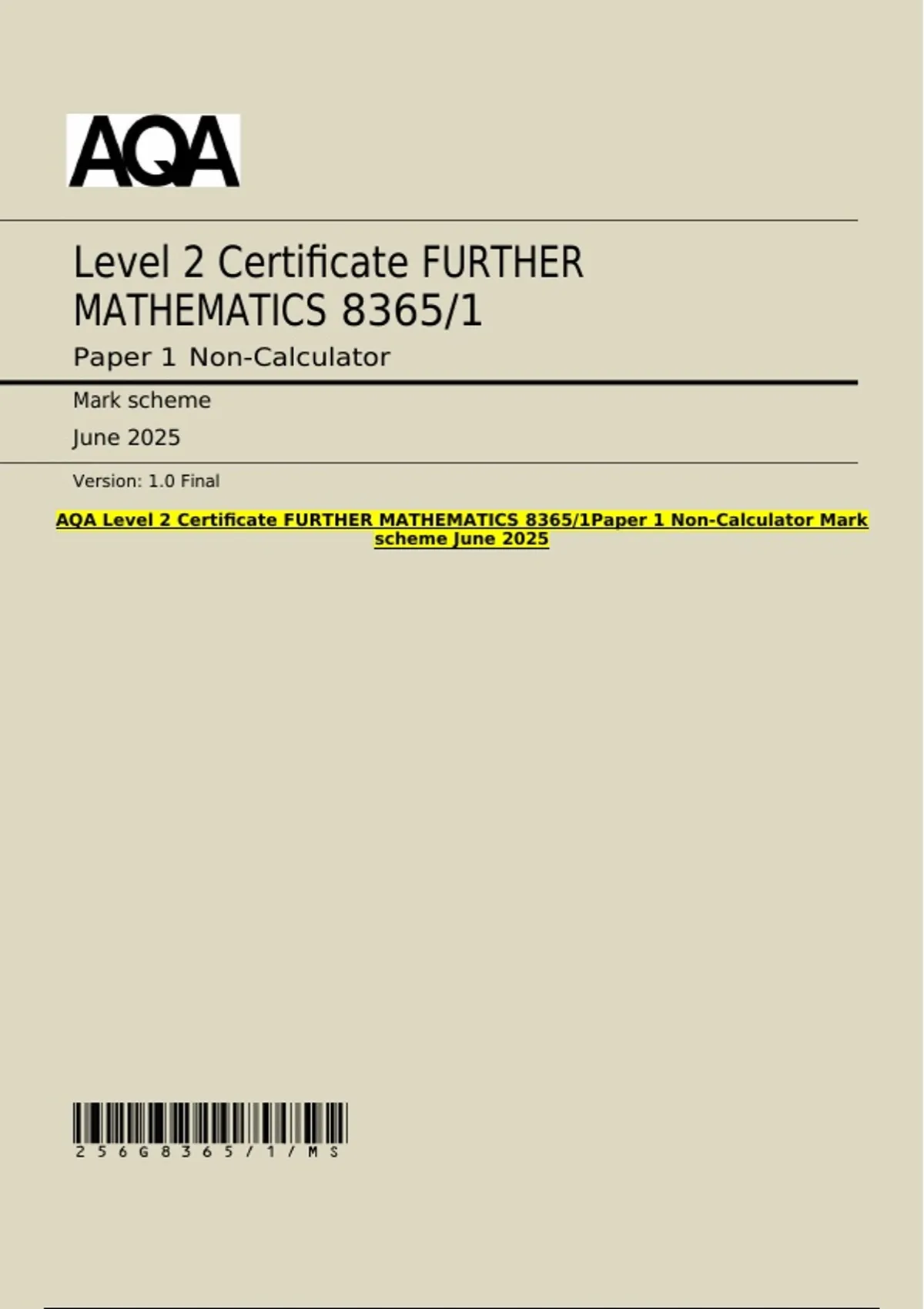 AQA Level 2 Certificate FURTHER MATHEMATICS 8365/1Paper 1 Non-Calculator Mark scheme June 2025