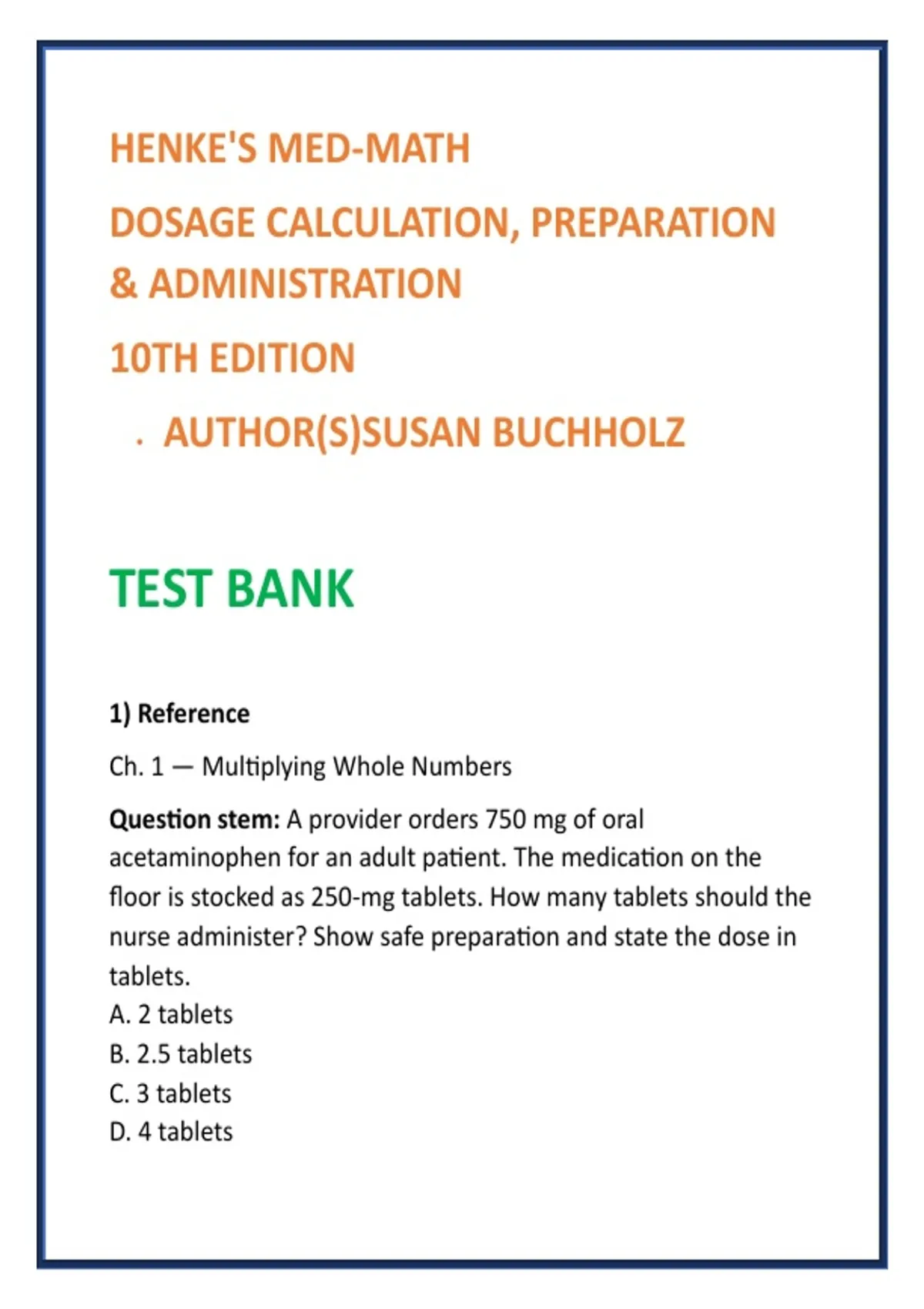 Henke’s Med-Math Test Bank 2026 | Nursing Test Bank 2026 Dosage Calculation MCQs & Medication Administration Math Review 2) SEO Product Description (200–300 words) Master nursing dosage calculations with confidence using this comprehensive Henke’s Med-Math Test Bank, fully aligned with Henke’s Med-Math: Dosage Calculation, Preparation & Administration, 10th Edition by Susan Buchholz. Designed for accuracy, safety, and exam success, this digital nursing test bank delivers full textbook coverage across all chapters and units, making it an essential resource for nursing students and educators. Each chapter includes 20 calculation-focused multiple-choice questions (MCQs) built around realistic medication-administration scenarios. Every question features verified answers with step-by-step rationales, reinforcing correct mathematical thinking while highlighting common medication errors and patient-safety risks. The content emphasizes dimensional analysis, ratio–proportion, unit conversion, and safe dose verification, mirroring expectations in nursing dosage calculation exams and clinical practice. This medication math study guide is ideal for learners seeking efficient, targeted practice that reduces calculation errors and strengthens clinical judgment. Whether preparing for quizzes, high-stakes dosage exams, skills check-offs, or NCLEX-style assessments, this test bank supports confident, accurate medication administration. Key Features Full-chapter coverage of Henke’s Med-Math (10th Edition) 20 nursing dosage calculation MCQs per chapter Step-by-step calculation rationales for every question Oral, parenteral, IV, pediatric, and weight-based dosing scenarios Strong focus on medication safety and error prevention Aligned with PN/LPN, ADN, and pre-licensure BSN coursework Widely recognized as a gold-standard Buchholz med-math review, this nursing test bank is a time-saving, high-impact tool for dosage calculation mastery and clinical readiness. 3) 8 High-Value SEO Keywords Henke’s Med-Math test bank nursing dosage calculation MCQs medication administration math study guide Buchholz med-math review nursing calculation test bank 2026 dosage calculation nursing exam practice nursing medication math questions dimensional analysis nursing test bank 4) 10 Hashtags #HenkeMedMath #NursingTestBank #DosageCalculation #MedicationAdministration #NursingMath #MedicationSafety #NursingMCQs #LPNtoRN #ADNNursing #NCLEXPrep