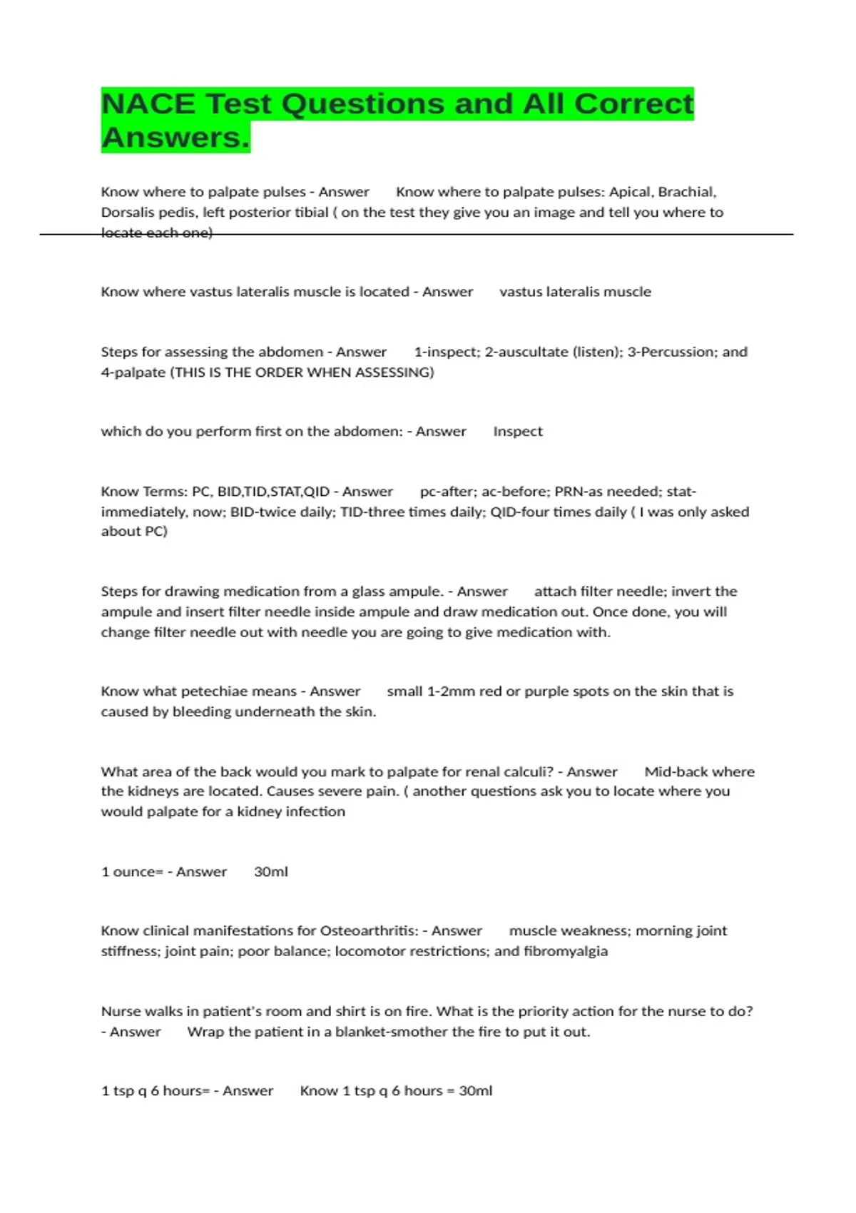 Know where to palpate pulses - Answer Know where to palpate pulses: Apical, Brachial, Dorsalis pedis, left posterior tibial ( on the test they give you an image and tell you where to locate each one) Know where vastus lateralis muscle is located - Answer vastus lateralis muscle Steps for assessing the abdomen - Answer 1-inspect; 2-auscultate (listen); 3-Percussion; and 4-palpate (THIS IS THE ORDER WHEN ASSESSING) which do you perform first on the abdomen: - Answer Inspect Know Terms: PC, BID,TID,STAT,QID - Answer pc-after; ac-before; PRN-as needed; stat-immediately, now; BID-twice daily; TID-three times daily; QID-four times daily ( I was only asked about PC) Steps for drawing medication from a glass ampule. - Answer attach filter needle; invert the ampule and insert filter needle inside ampule and draw medication out. Once done, you will change filter needle out with needle you are going to give medication with. Know what petechiae means - Answer small 1-2mm red or purple spots on the skin that is caused by bleeding underneath the skin. What area of the back would you mark to palpate for renal calculi? - Answer Mid-back where the kidneys are located. Causes severe pain. ( another questions ask you to locate where you would palpate for a kidney infection 1 ounce= - Answer 30ml Know clinical manifestations for Osteoarthritis: - Answer muscle weakness; morning joint stiffness; joint pain; poor balance; locomotor restrictions; and fibromyalgia Nurse walks in patient's room and shirt is on fire. What is the priority action for the nurse to do? - Answer Wrap the patient in a blanket-smother the fire to put it out. 1 tsp q 6 hours= - Answer Know 1 tsp q 6 hours = 30ml