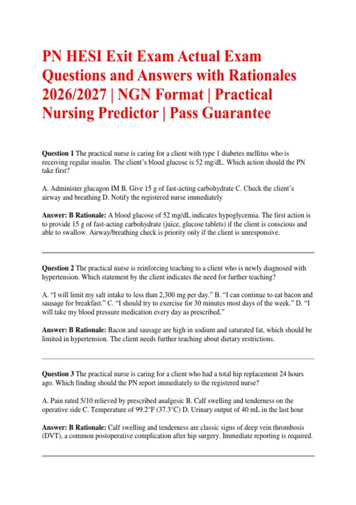 This document contains the PN HESI Exit Exam for the 2026/2027 academic year, featuring actual exam-style questions with correct answers and detailed rationales in the NGN format. It is designed as a comprehensive practical nursing predictor, focusing on clinical judgment, prioritization, patient safety, and NCLEX-PN–style competencies to support exam success.