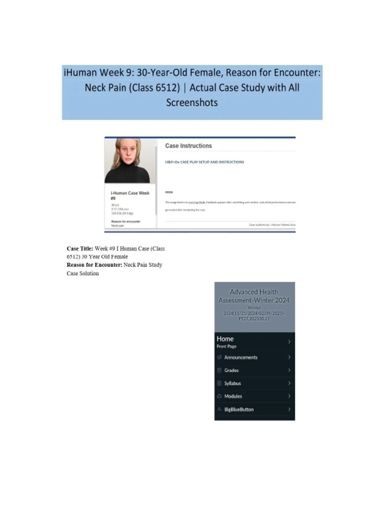 Comprehensive iHuman Case Study: 30-Year-Old Female Reason for Encounter Neck Pain (Class 6512) | iHuman Case Analysis Week #9 | Includes HPI, PE, Differential Diagnosis, and Management Plan Case