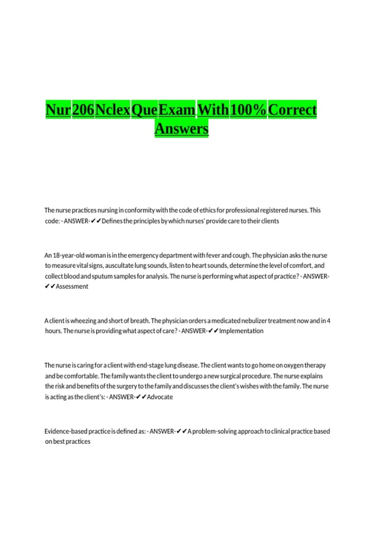 Nur 206 Nclex Que Exam With 100% Correct v v v v vv v v