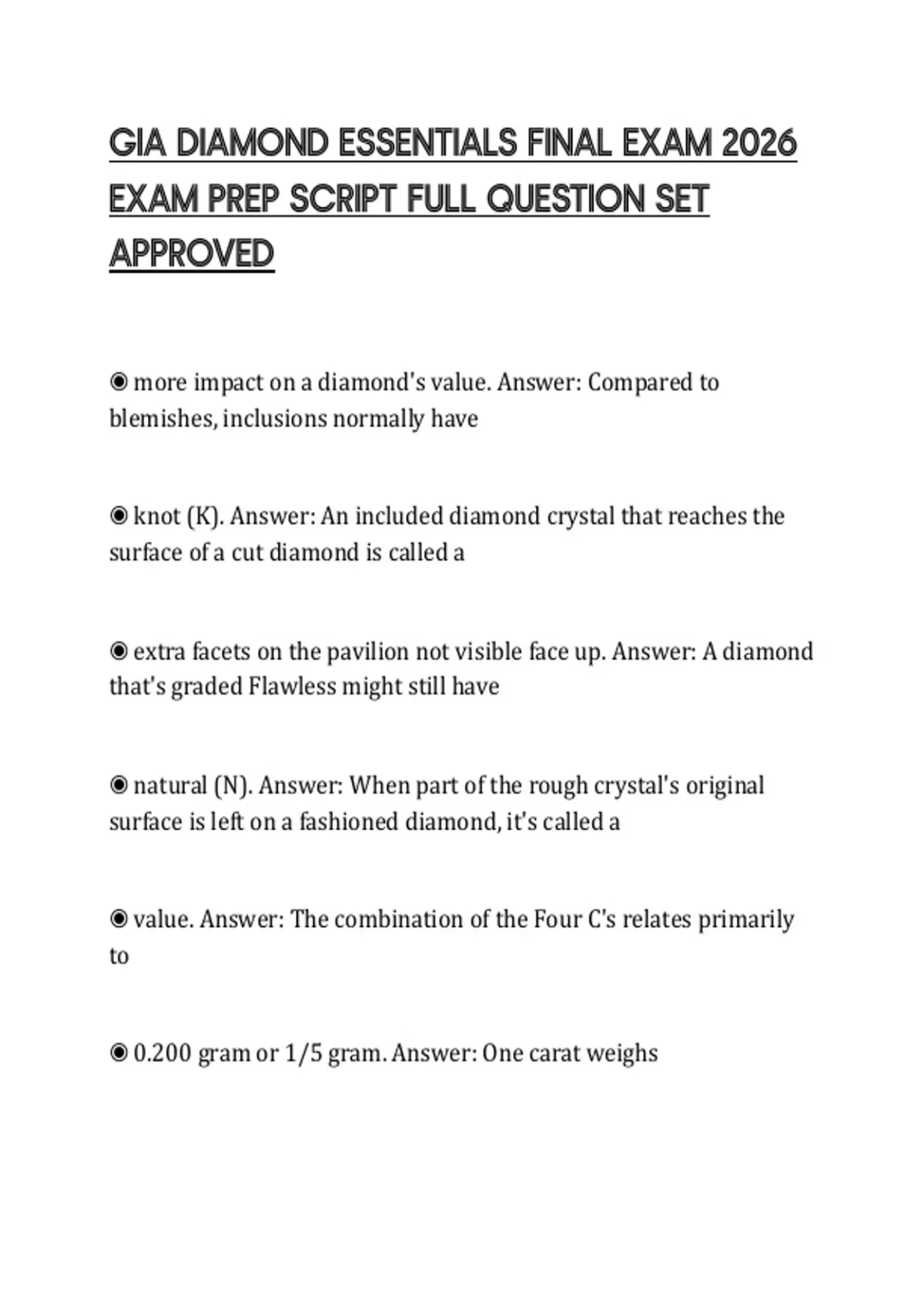 GIA DIAMOND ESSENTIALS FINAL EXAM 2026 EXAM PREP SCRIPT FULL QUESTION SET APPROVED