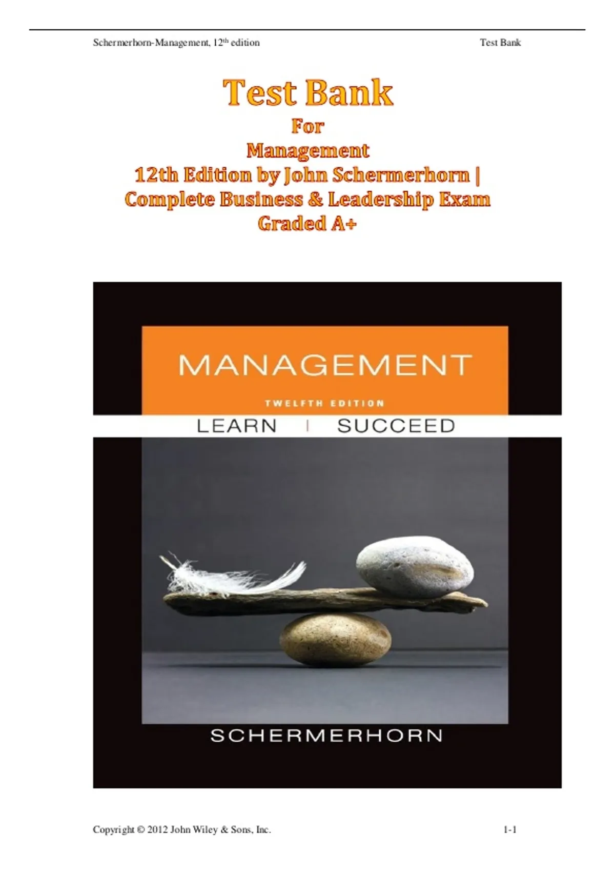 This document contains the official test bank for Management, 12th Edition by John R. Schermerhorn Jr., covering Chapters 1 and 2. It includes a comprehensive collection of true/false questions, multiple-choice questions, and essay questions with answers, aligned to learning objectives, difficulty levels, AACSB standards, and Bloom’s Taxonomy. The material is suitable for exam preparation, practice testing, and reinforcing core management concepts such as managerial roles, organizational trends, productivity, globalization, and management theories.