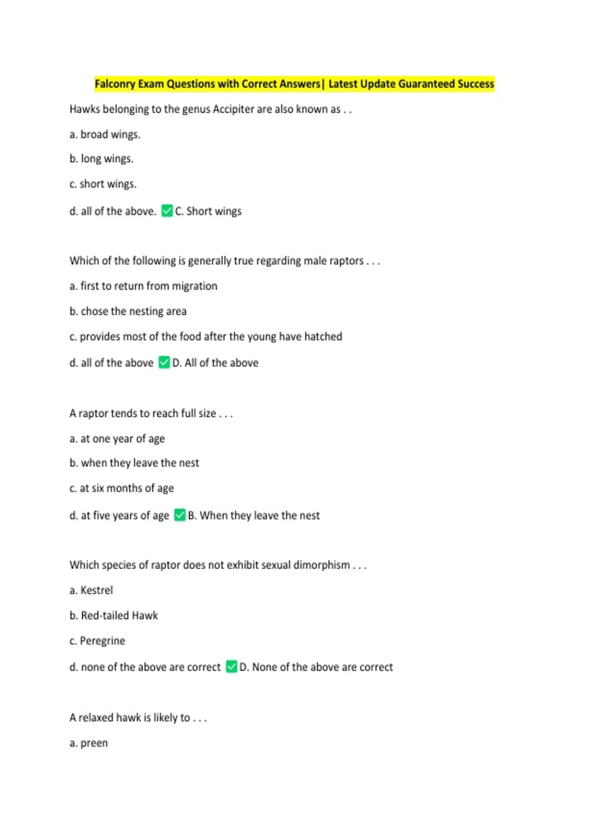 Falconry Exam Questions with Correct Answers| Latest Update Guaranteed Success