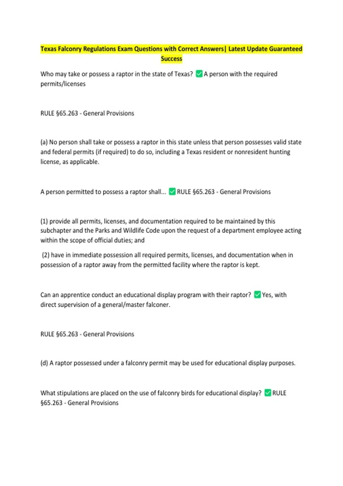 Texas Falconry Regulations Exam Questions with Correct Answers| Latest Update