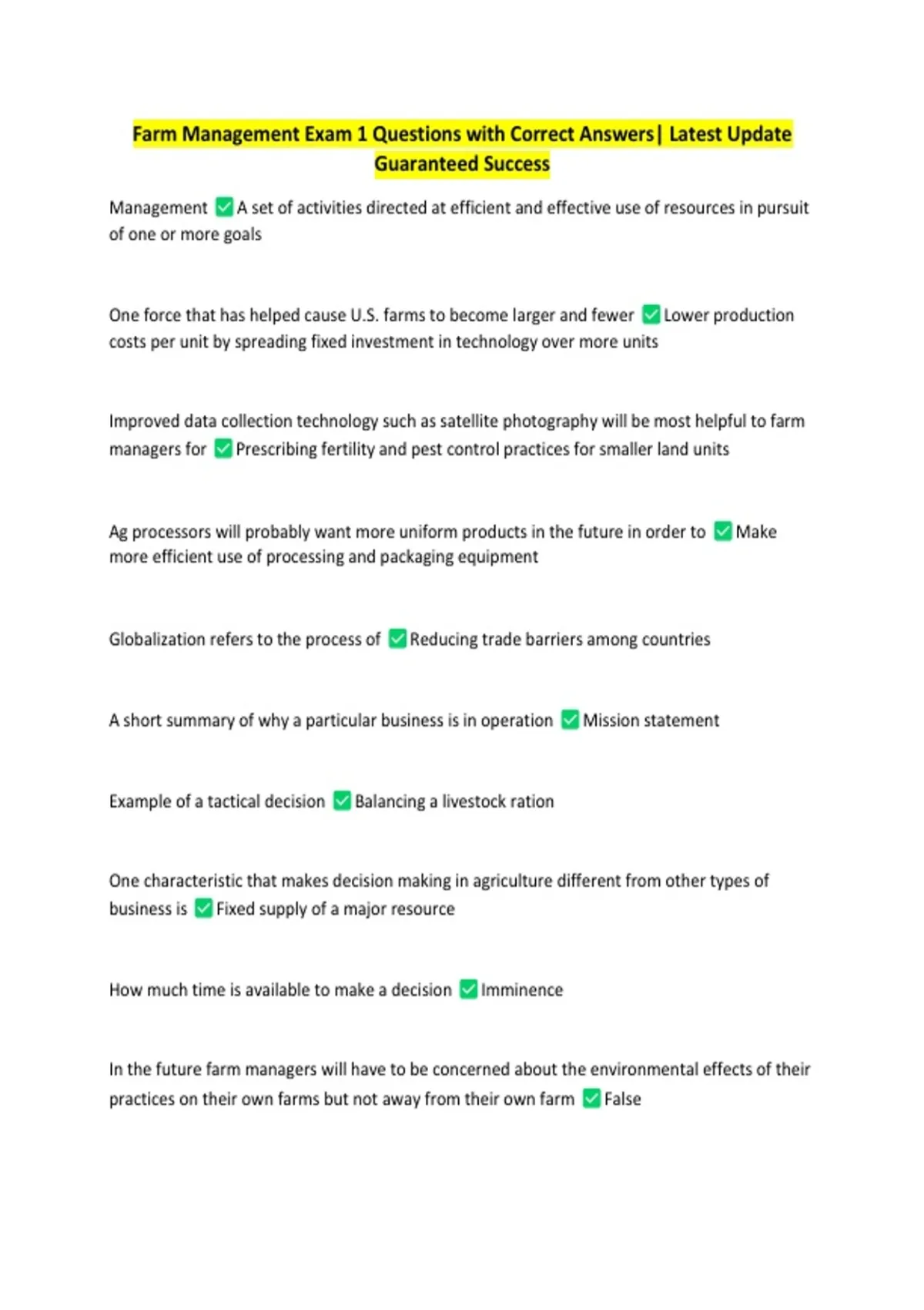 Farm Management Exam 1 Questions with Correct Answers| Latest Update