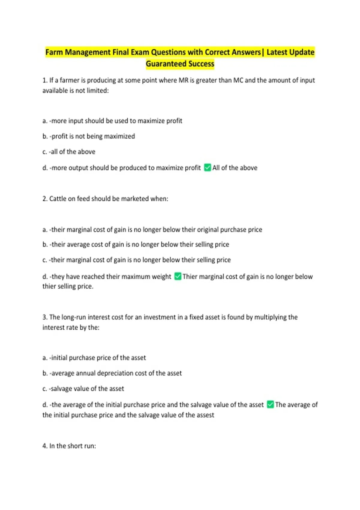 Farm Management Final Exam Questions with Correct Answers| Latest Update