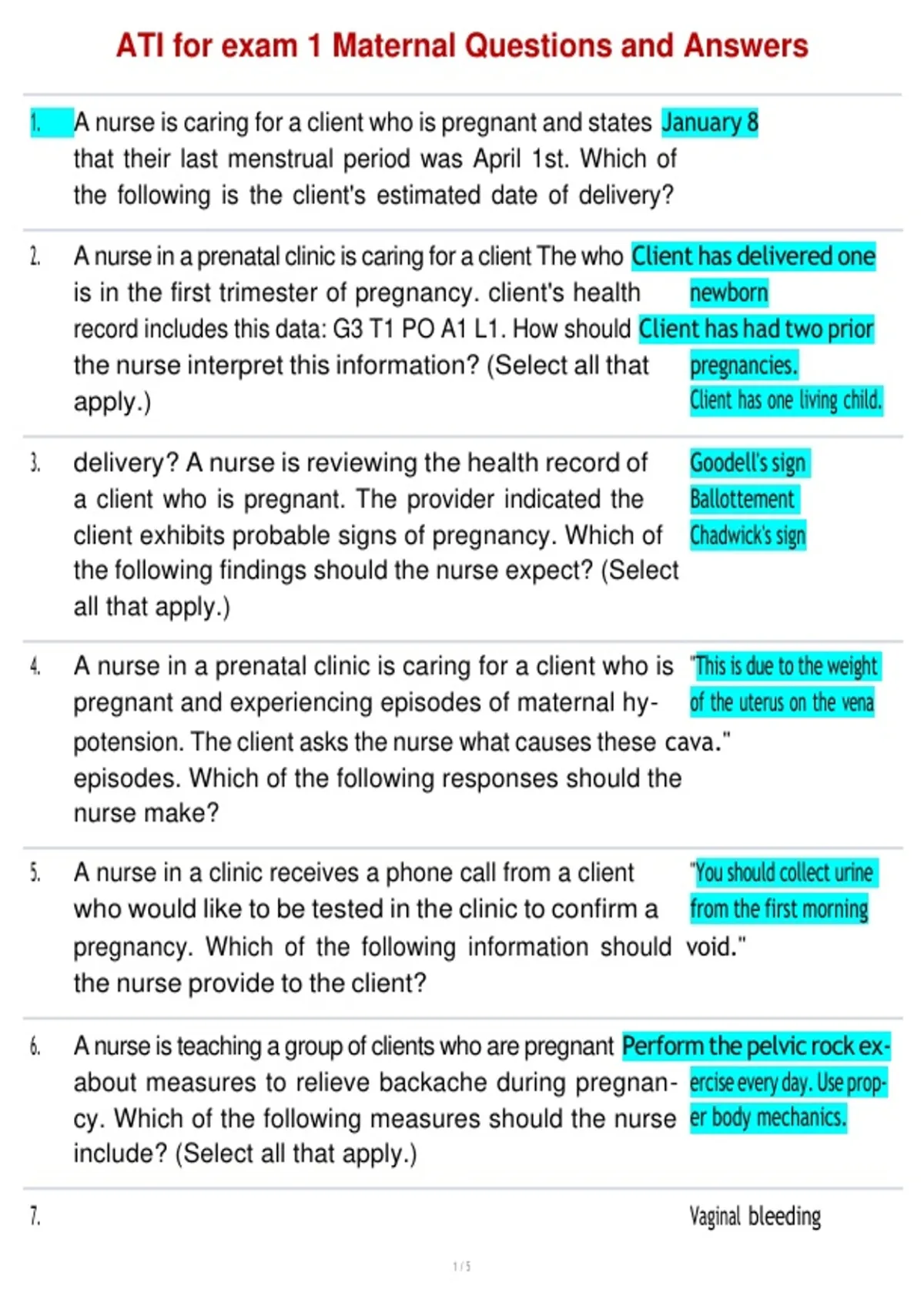 , ATI for exam 1 Maternal Questions and Answers
