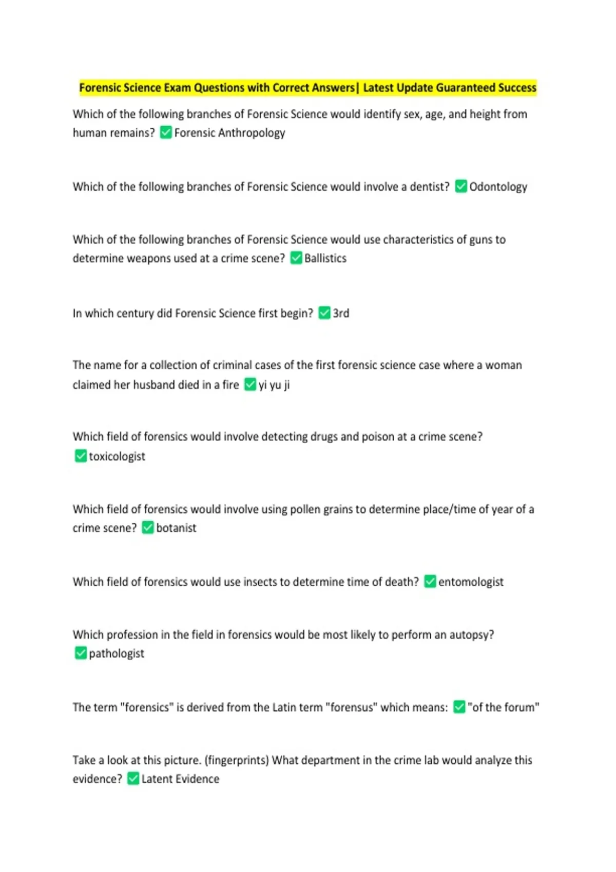 Forensic Science Exam Questions with Correct Answers| Latest Update Guaranteed Success