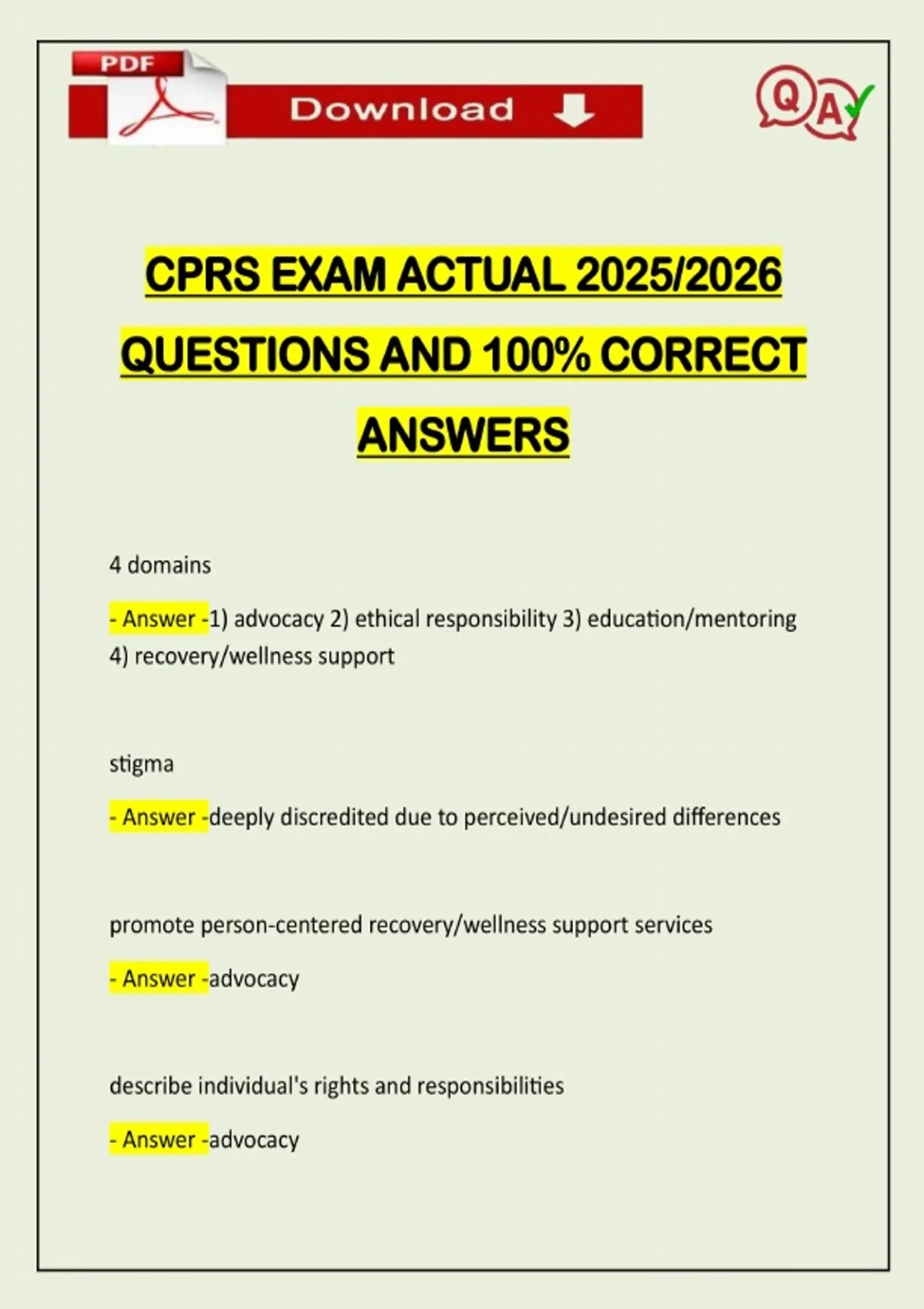 CPRS EXAM ACTUAL 2025/2026 QUESTIONS AND 100% CORRECT ANSWERS 4 domains - Answer -1) advocacy 2) ethical responsibility 3) education/mentoring 4) recovery/wellness support stigma - Answer -deeply discredited due to perceived/undesired differences promote person-centered recovery/wellness support services - Answer -advocacy describe individual's rights and responsibilities - Answer -advocacyNeed assistance on Online classes, Exams & Assignments? Reach out for instant help!! Full Course Assistance, Plagiarism-free Essay Writing, Research Paper, Dissertation, Discussion Posts, etc…. Confidential & Secure services. Tutors are available for all subjects! Email now at: apply principles of individual choice and self-determination - Answer -advocacy use person centered language - Answer -advocacy collaborate to identify and coordinate choices with resources - Answer -advocacy
