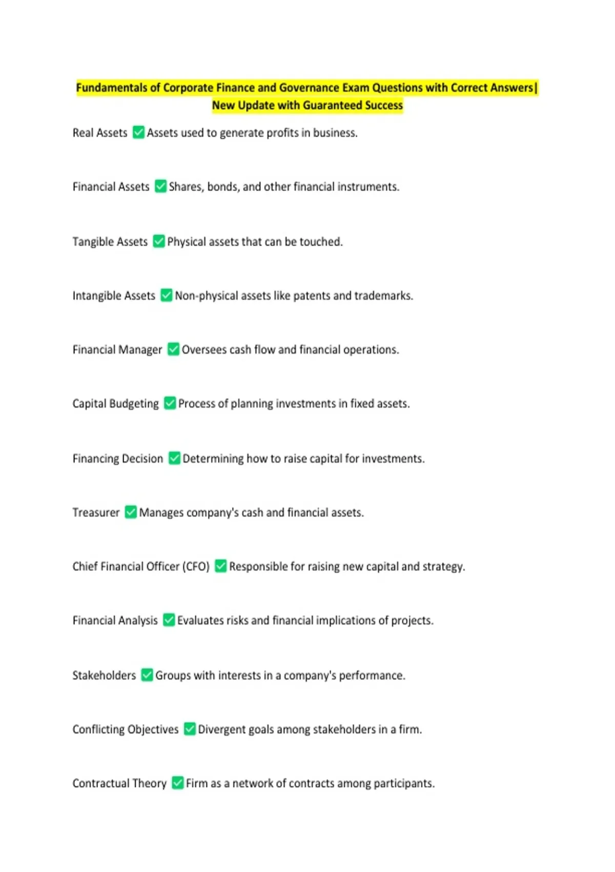 Fundamentals of Corporate Finance and Governance Exam Questions with Correct Answers|
