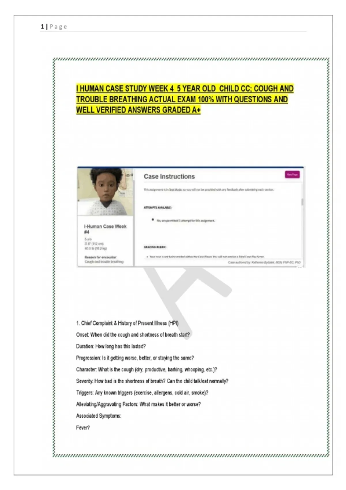 This comprehensive i-Human case study focuses on a 5-year-old patient presenting with cough and difficulty breathing, analyzed during Week 4 of Class 6541. It includes a detailed history of present illness, physical exam findings, differential diagnoses, and a management plan tailored for pediatric respiratory distress. The case emphasizes critical nursing assessment skills and clinical decision-making relevant for nursing students. Updated for 2025, it offers a current, practical scenario for exam preparation and classroom learning. Ideal for nursing students aiming to improve pediatric case analysis and care planning.