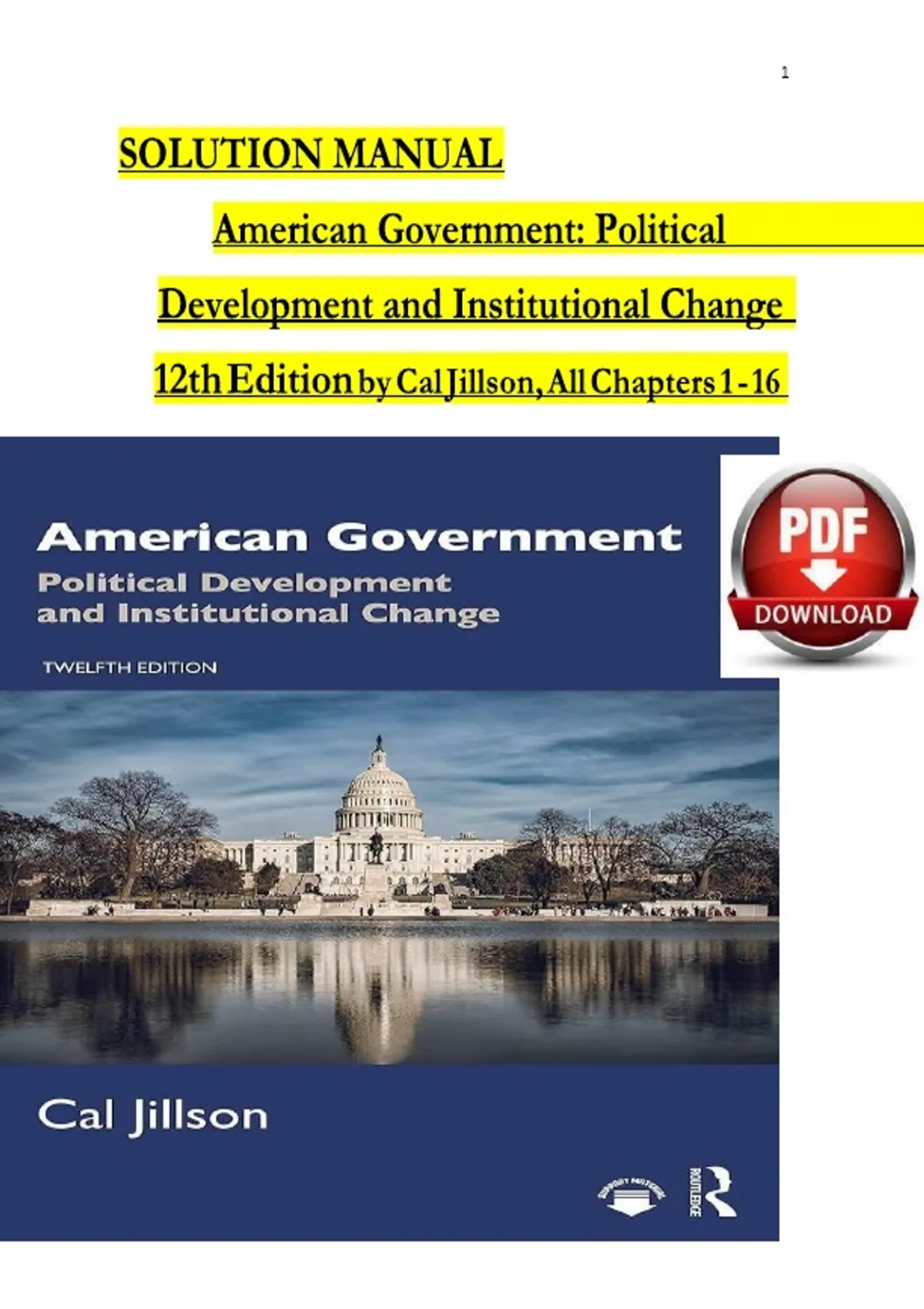 SOLUTION MANUAL For American Government: Political Development and Institutional Change 12th Edition by Cal Jillson, Verified Chapters 1 - 16, Complete Newest Version