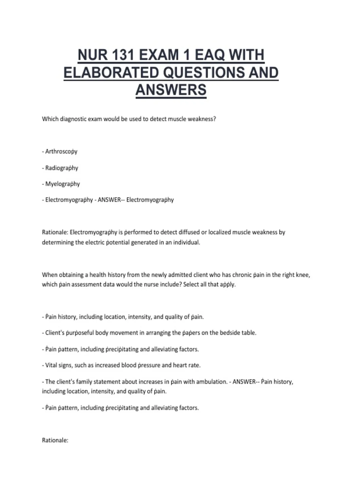 This document contains elaborated extended-answer questions (EAQs) with detailed answers for NUR 131 Exam 1, focusing on core nursing fundamentals and key theoretical concepts. It is designed to support exam preparation by explaining reasoning behind each answer and reinforcing essential nursing principles commonly tested in the first exam.