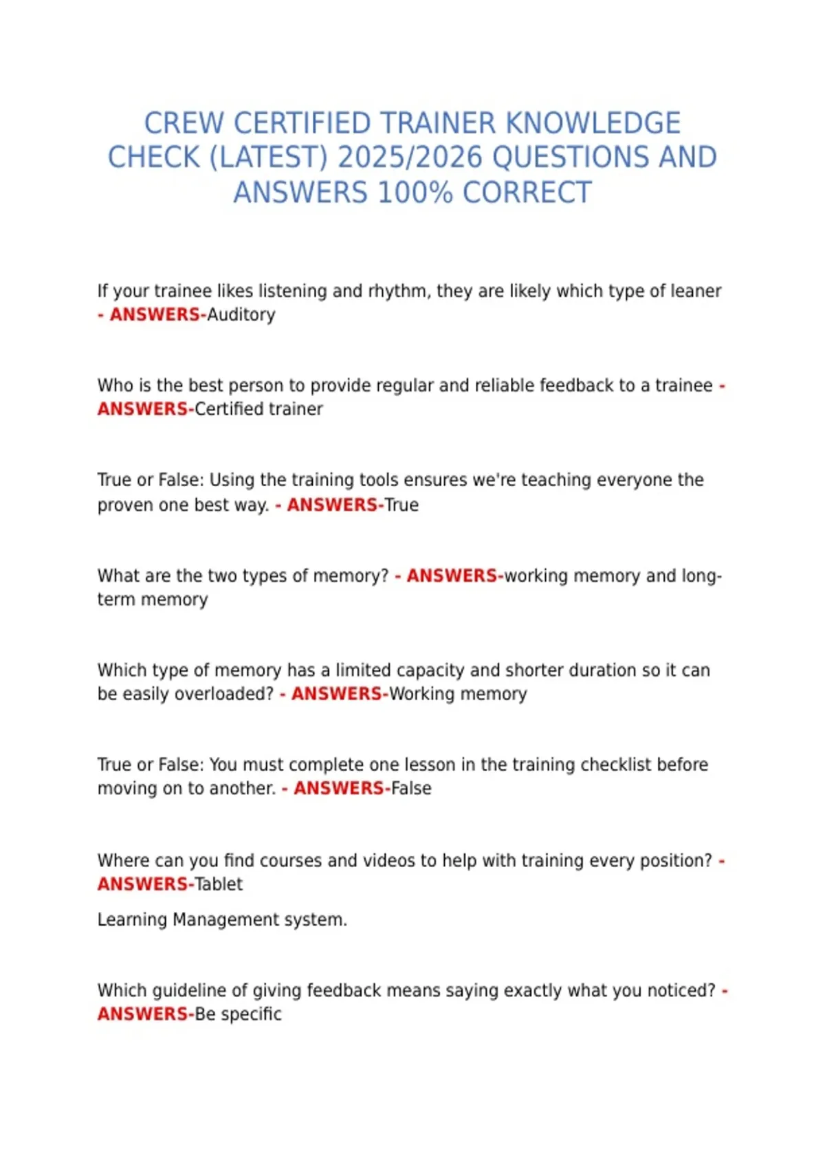Crew Certified Trainer Knowledge Check | 2025/2026 Questions & Verified Answers