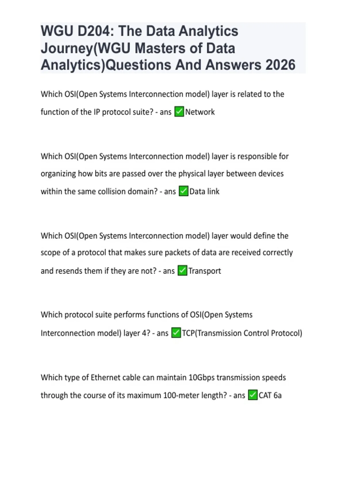 This document contains structured questions and clear answers for WGU D204: The Data Analytics Journey in the Master of Science in Data Analytics program. It covers key concepts such as the data analytics lifecycle, business problem framing, data acquisition, data preparation, analysis, visualization, and communicating insights. The material is designed to support focused exam preparation and revision aligned with the 2026 WGU D204 assessment.