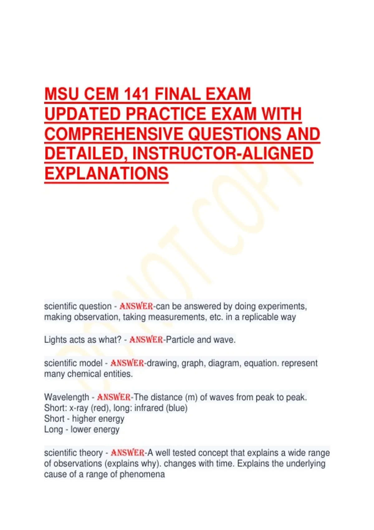 MSU CEM 141 FINAL EXAM UPDATED PRACTICE EXAM WITH COMPREHENSIVE QUESTIONS AND DETAILED, INSTRUCTOR-ALIGNED EXPLANATIONS