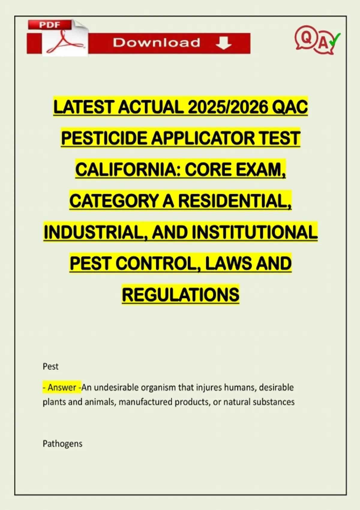 LATEST ACTUAL 2026 QAC PESTICIDE APPLICATOR TEST CALIFORNIA: CORE EXAM, CATEGORY A RESIDENTIAL, INDUSTRIAL, AND INSTITUTIONAL PEST CONTROL, LAWS AND REGULATIONS