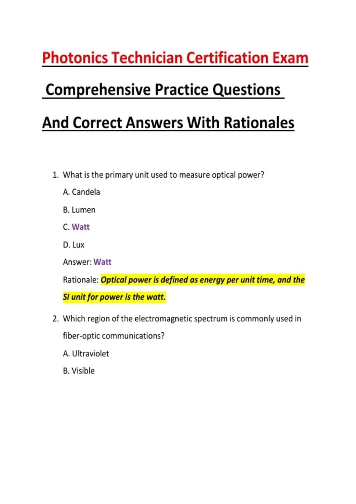 This document contains a comprehensive set of 100 practice questions for the Photonics Technician Certification Exam, each with correct answers and clear rationales. It covers core photonics topics such as fiber optics, lasers, detectors, dispersion, attenuation, safety, connectors, measurements, and optical communication systems. The material is well suited for exam preparation, revision, and self-testing for students and technicians in photonics and fiber-optic technology.