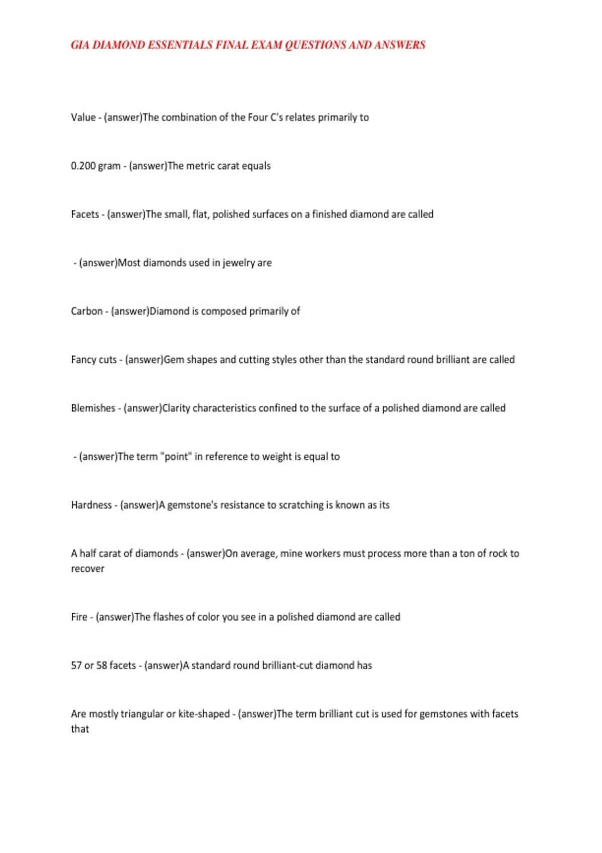 GIA DIAMOND ESSENTIALS FINAL EXAM QUESTIONS AND ANSWERS