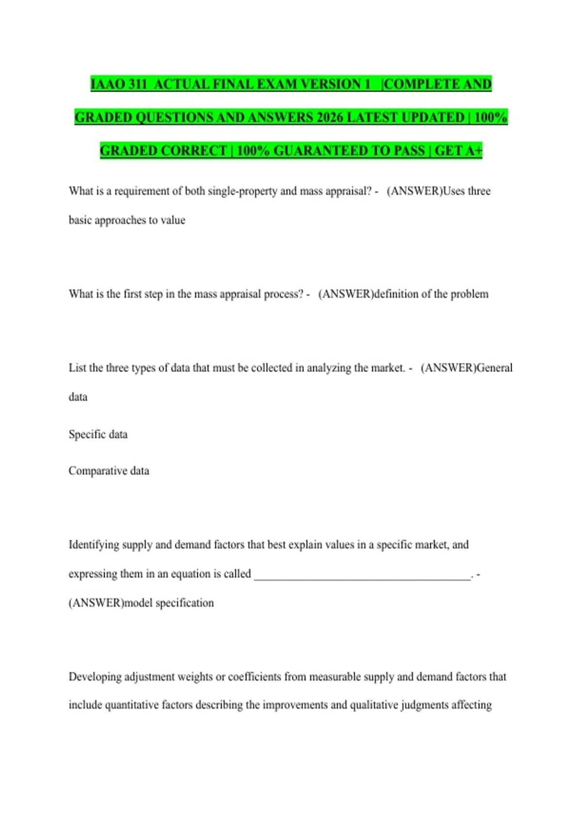 IAAO 311 ACTUAL FINAL EXAM VERSION 1 |COMPLETE AND GRADED QUESTIONS AND ANSWERS 2026 LATEST UPDATED | 100% GRADED CORRECT | 100% GUARANTEED TO PASS | GET A+